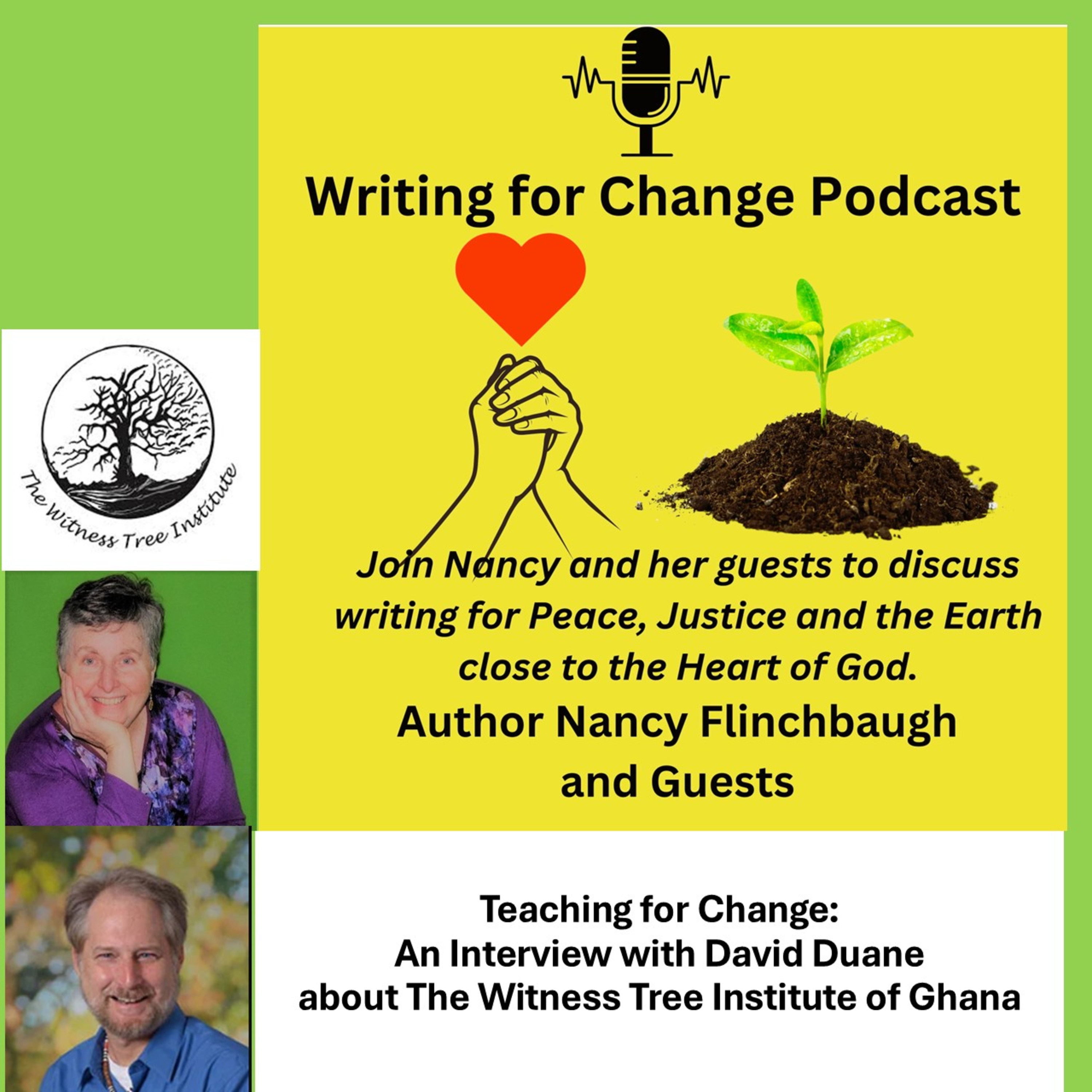 In this podcast, Author Nancy Flinchbaugh interviews educator David Duane about his work in teaching for change with The Witness Tree Institute of Ghana. witnesstreeinstitute.org