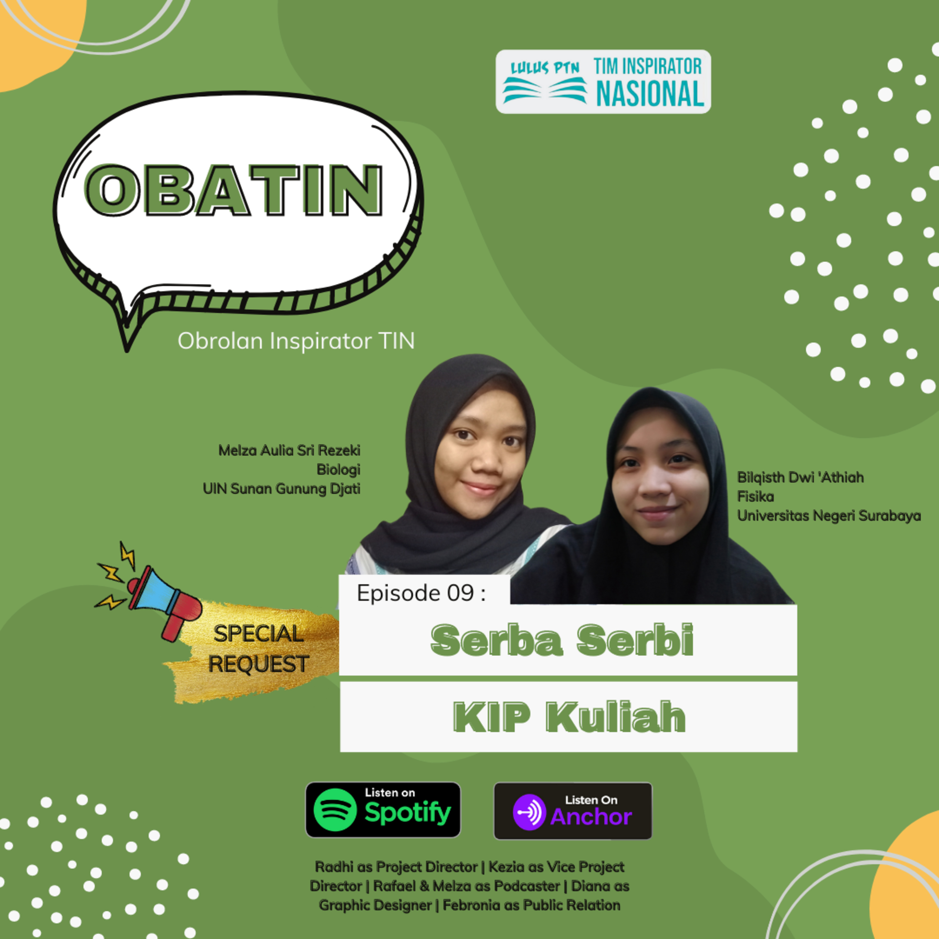Selamat malam minggu ya. Pada Eps. 9 OBATIN malam hari ini, kami akan membahas "Serba-Serbi KIP Kuliah". Episode kali ini adalah spesial request dari @jumparini26_ dan tentunya malam minggu kamu kali ini akan ditemani oleh kak Melza Aulia dan kak Bilqisth Dwi 'Athiah🤩