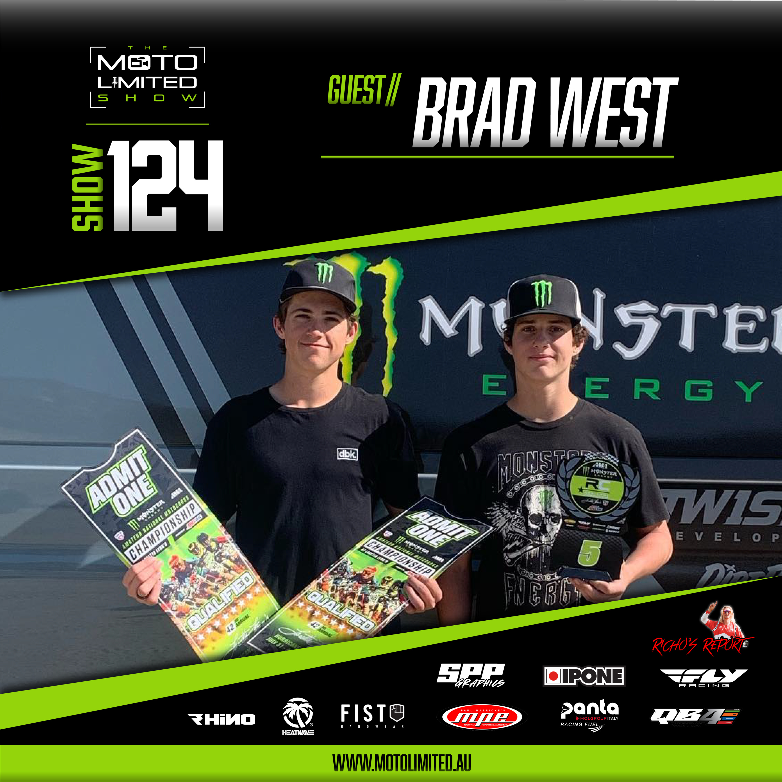 Show 124, Trent is back for another epic Moto Limited Show. On tonight's show, Richo is back with the Fist Handwear Richo Report, and man the boys break down Thunder Valley and the chaos that was. Then Brad West calls into the show to discuss his first-ever Pro race at Pala and his prep for Loretta's.
