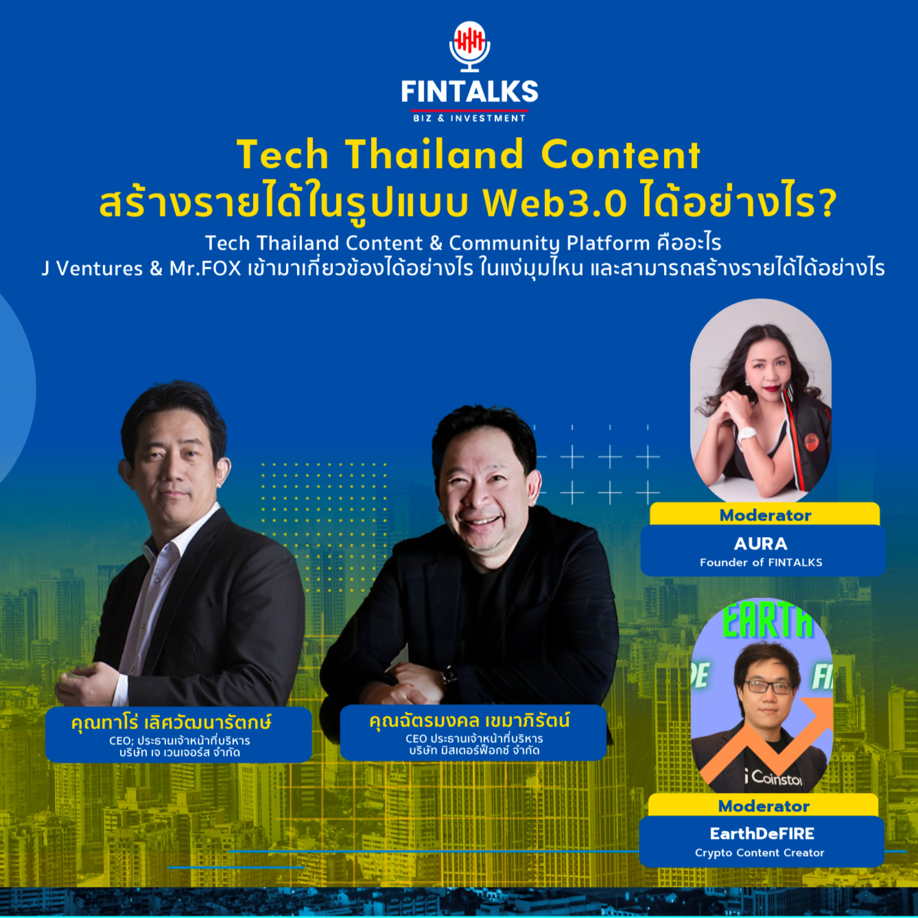 FIN Talks Club วันพฤหัสที่ 27 กรกฎาคม 2023 เวลา 21:00 น. Tech Thailand Content & Community Platform คืออะไร J Ventures & Mr.FOX เข้ามาเกี่ยวข้องได้อย่างไร ในแง่มุมไหน และสามารถสร้างรายได้ได้อย่างไร Speaker คุณทาโร่ เลิศวัฒนารักษ์ Taro ThanawatCEO; ประธานเจ้าหน้าที่บริหาร บริษัท เจ เวนเจอร์ส จำกัด คุณฉัตรมงคล เขมาภิรัตน์ CEO ประธานเจ้าหน้าที่บริหาร บริษัท มิสเตอร์ฟ็อกซ์ จำกัด Click เข้าฟัง https://www.clubhouse.com/invite/Gcf0vX2kกด follow FIN Talks Club เพื่อไม่พลาดความรู้ดีๆ จากกูรูผู้มีประสบการณ์ตรง ผ่านช่องทางต่างๆดังนี้ Line official: https://lin.ee/i1dgkFQLive Session: • Clubhouse: https://www.clubhouse.com/club/fin-talks• FB: https://www.facebook.com/FINTalksBizInvestment• YouTube: https://www.youtube.com/channel/UCQIvRxnMTj0GX61qcgc83ow/Rerun Podcast (ฟังย้อนหลัง): • Apple Podcast: https://podcasts.apple.com/.../fin-talks.../id1576996864• Google Podcast: https://podcasts.google.com/.../aHR0cHM6Ly9hbmNob3IuZm0vc...• Spotify: https://open.spotify.com/show/1mh3iOXydzaplTz4xdHDmf• Anchor: https://anchor.fm/fin-talks• Twitter: https://twitter.com/FINTalksBiz