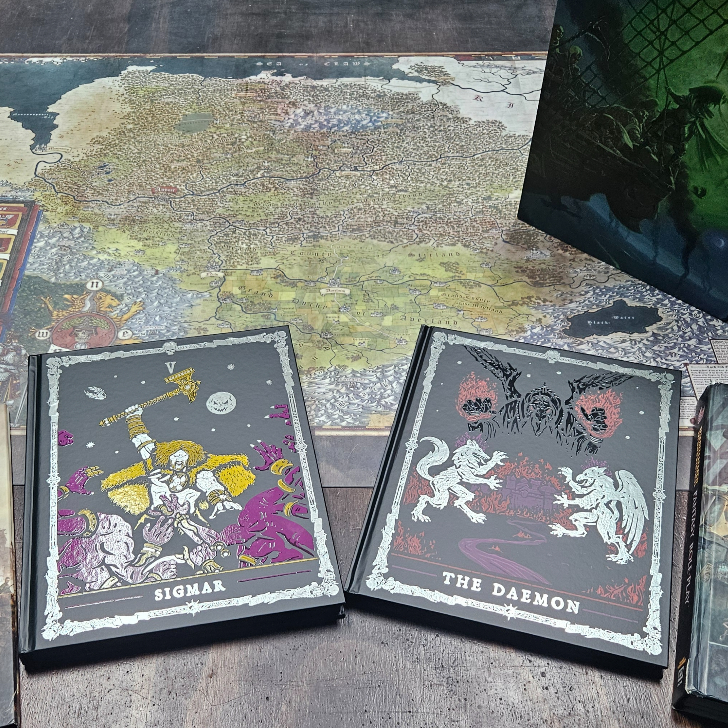 My wife usually does the cover clip art. Today is a picture of one of our table set ups showing Book 5, Empire in Ruins and the Companion deluxe covers (cover designs by Sam Manley and Andy Law, the box cover (by Ralph Horsley), and a map of the Empire (cartography by Jared Blando)You can send me a message (voice or text) via a DM on Discord, as an attachment to my email (gmologist@gmail) or to my Speakpipe account: https://www.speakpipe.com/TheGmologistPresents