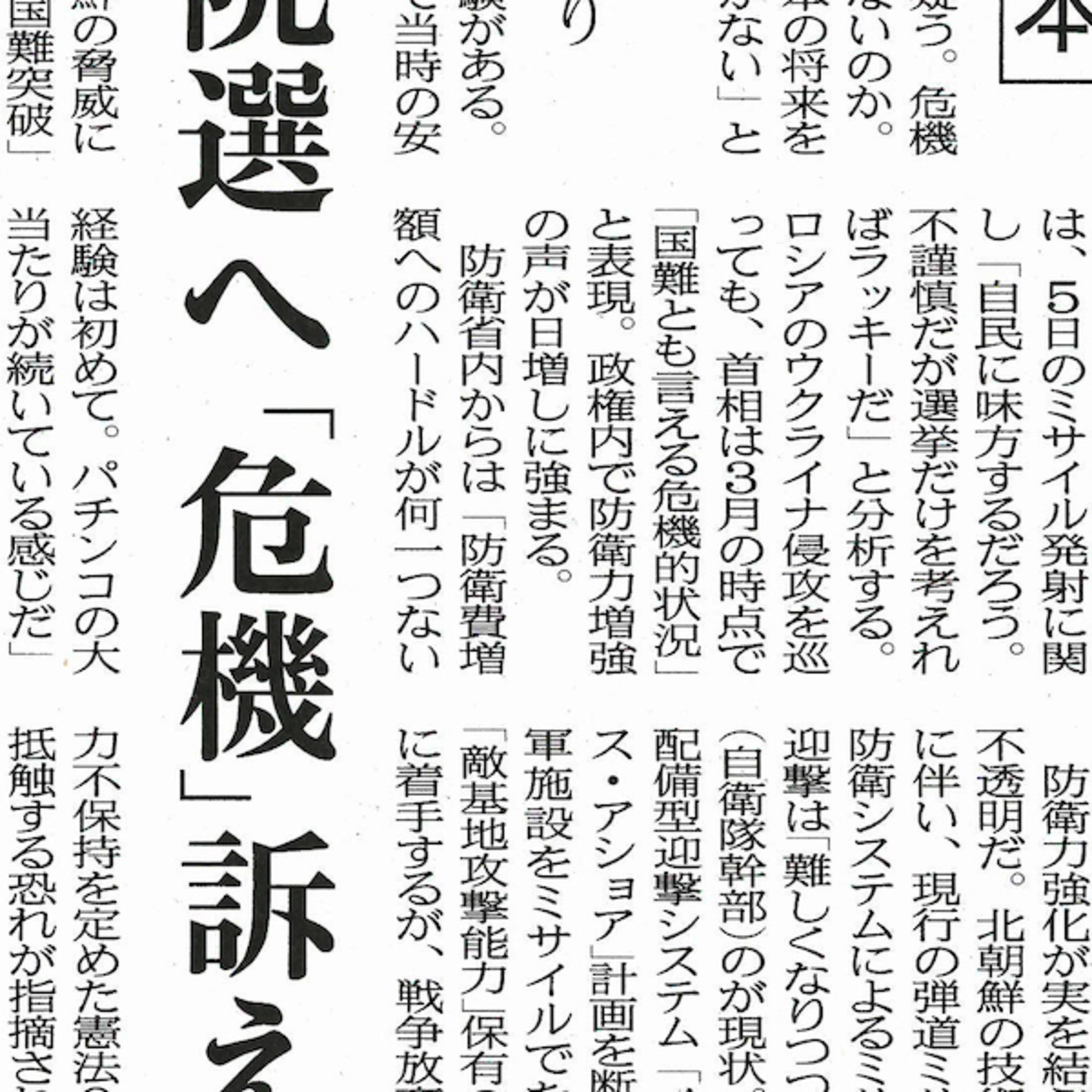 2022年6月7日の北日本新聞の3面に「ミサイル 政権に追い風?」という見出しの記事が載りました。ミサイル発射によって参院選を有利に戦えるという与党側の思惑を記事にしたものでした。あまりにひどい彼らの考えに憤りました。軍事対軍事に陥らず、軍事的緊張を和らげ戦争を未然に防ぐための努力が大事だと主張する日本共産党などへ口汚い攻撃が今後一層強まるでしょう。記事にある茂木自民党幹事長の「耳を疑う。危機感も緊張感も全くないのか。そういう政党に日本の将来を任せるわけにはいかない」という言葉も紹介していました。自民党政権のもとで堅持してきた「専守防衛の国」から「先制攻撃ができる国」になるということは、相手国の攻撃対象に自ら嵌まり込んでいく行為ではないかと思います。