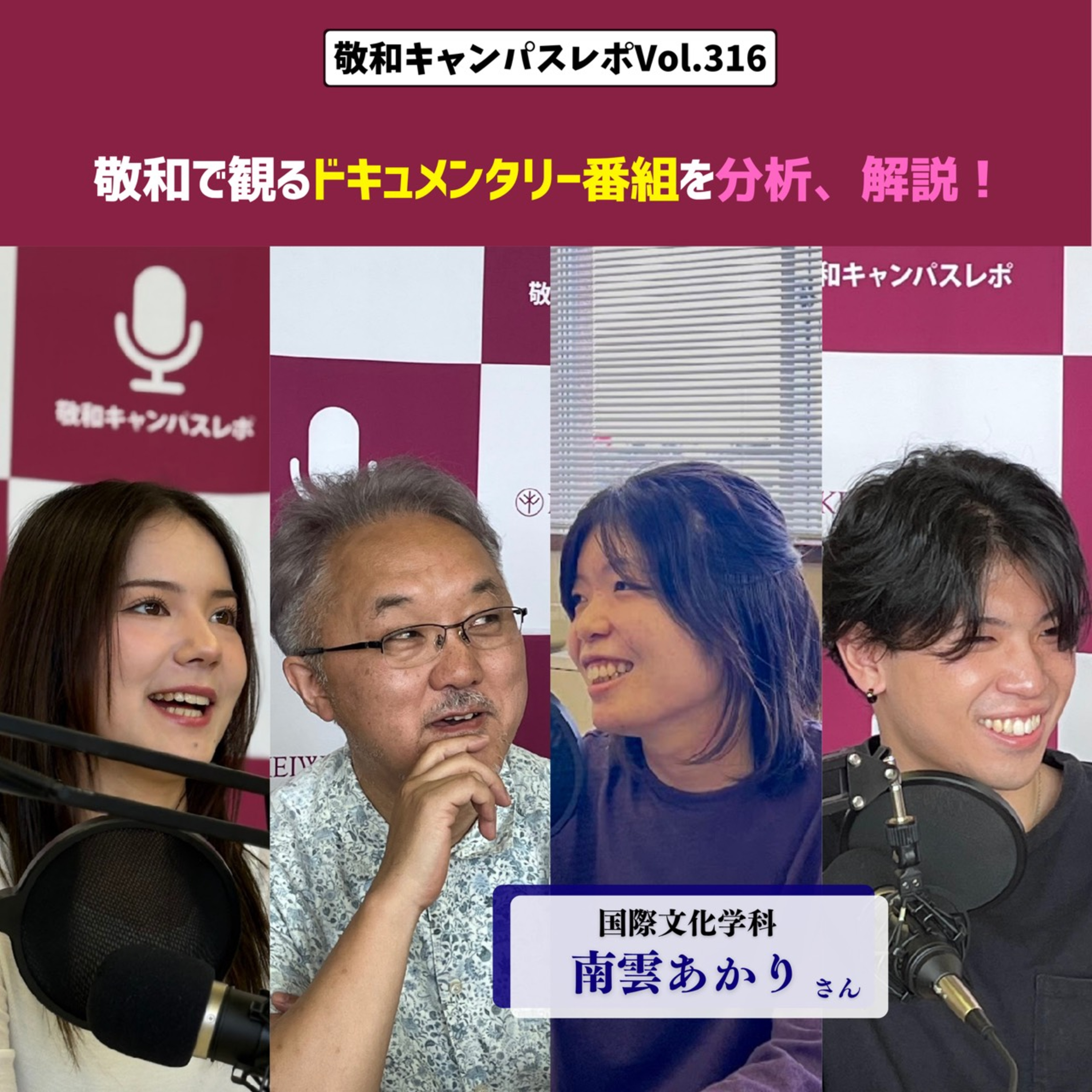 10/24の敬和キャンパスレポは、情報メディアコースでのドキュメンタリー視聴と分析に関する話題です。今回は情報メディアコースの中で、ドキュメンタリーを「作り手目線」で分析する活動について、国際文化学科2年生の南雲あかりさん、ドキュメンタリーの視聴・制作を指導している、番組ご意見番の国際文化学科教授の一戸信哉先生とともにお話を伺いました。