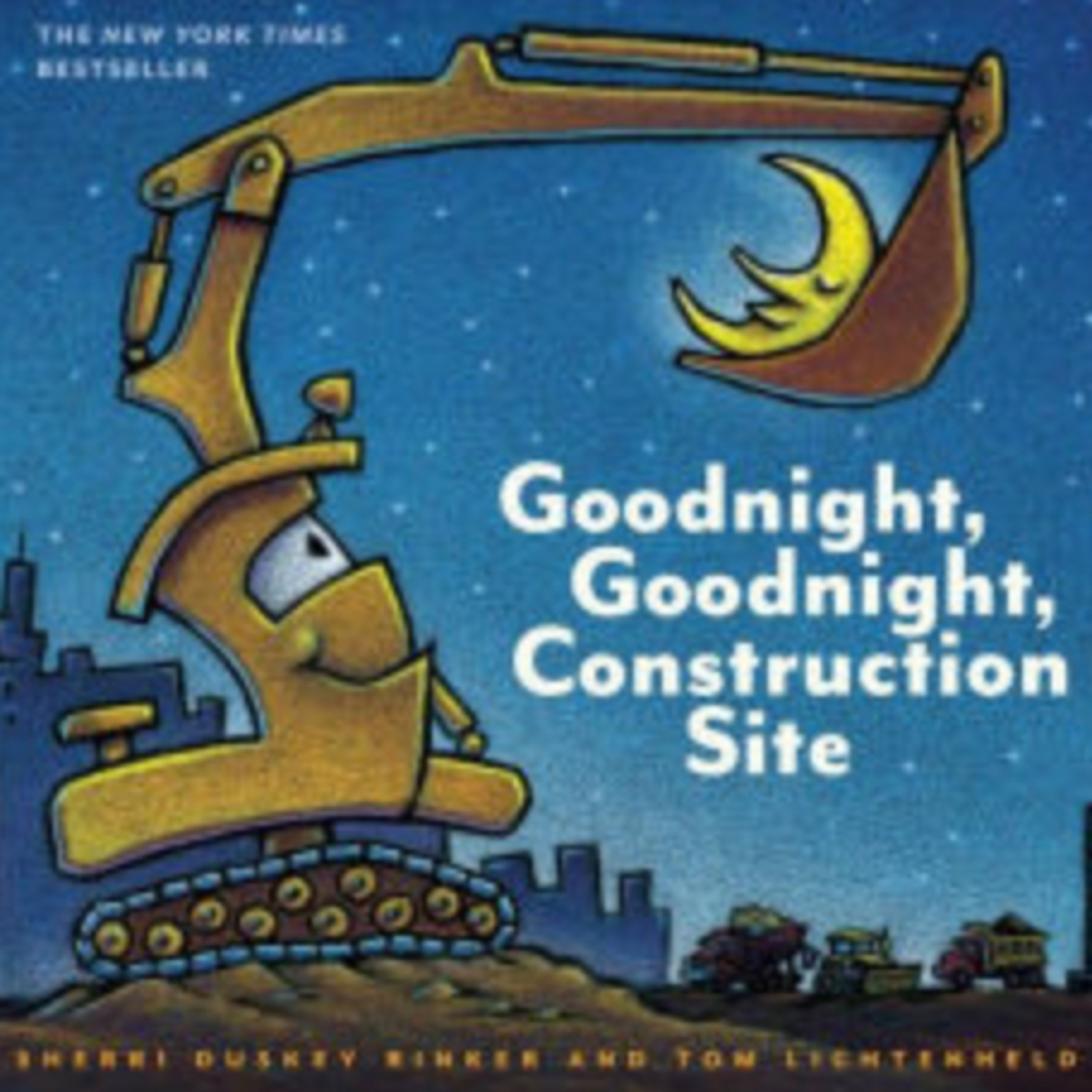 As the sun sets behind the big construction site, all the hardworking trucks get ready to say goodnight.