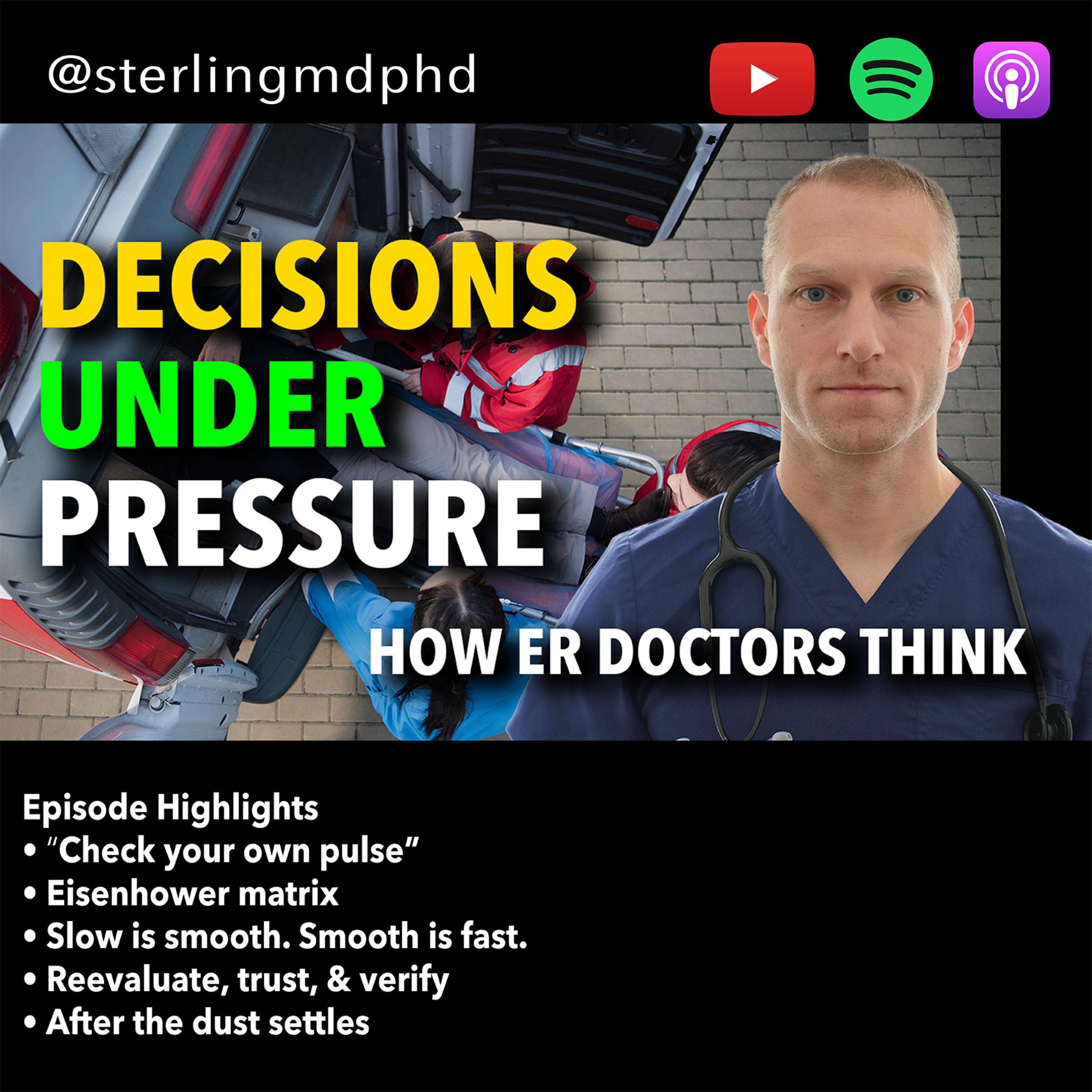In this episode, we cover a practical system ER doctors use to lead through high-pressure, high-stakes moments. I walk through a high-pressure scenario and break it into repeatable steps: checking your own pulse, clearing cognitive load, committing, prioritizing with the Eisenhower Matrix, executing safely (“slow is smooth, smooth is fast”), and cycling back to reevaluate and verify. We also talk about avoiding the “rise to the occasion” myth, delegating effectively, handling shifting priorities, and closing the loop to continually improve. Clear your mental bandwidth, commit to lead, prioritize what truly matters, execute safely, and reevaluate. Simple, repeatable steps you can use anywhere chaos shows up.#EmergencyMedicine #Leadership #HighPressure #EisenhowerMatrix #Teamwork #optimizeperformance #thepittChapters00:00 — Learn to lead under pressure00:38 — High-pressure & decision making02:06 — The “rise to the occasion” myth02:36 — Check your own pulse03:56 — Commit05:27 — Prioritizing with the Eisenhower Matrix07:13 — Execute and delegate07:33 — “Slow is smooth, smooth is fast”08:18 — Reevaluate, trust-but-verify, debriefSpotify Channel:https://podcasters.spotify.com/pod/show/sterlingmdphd/Social & Website:Instagram - https://www.instagram.com/sterlingmdphdX - https://x.com/sterlingmdphdFacebook - / sterlingmdphdNewsletter - http://eepurl.com/hQpdqTApple Podcasts: https://apple.co/3y438C9References & Show Notes:http://www.nicksterling.com/This content is not medical advice, is for general information purposes only,and does not constitute the practice of medicine or any other healthcare professional services. No doctor-patient relationship is formed. This content is not a substitute for medical evaluation or treatment and does not take precedence over information provided to you by your healthcare provider or official public health sources. Please visit http://nicksterling.com/terms for full Terms of Use.