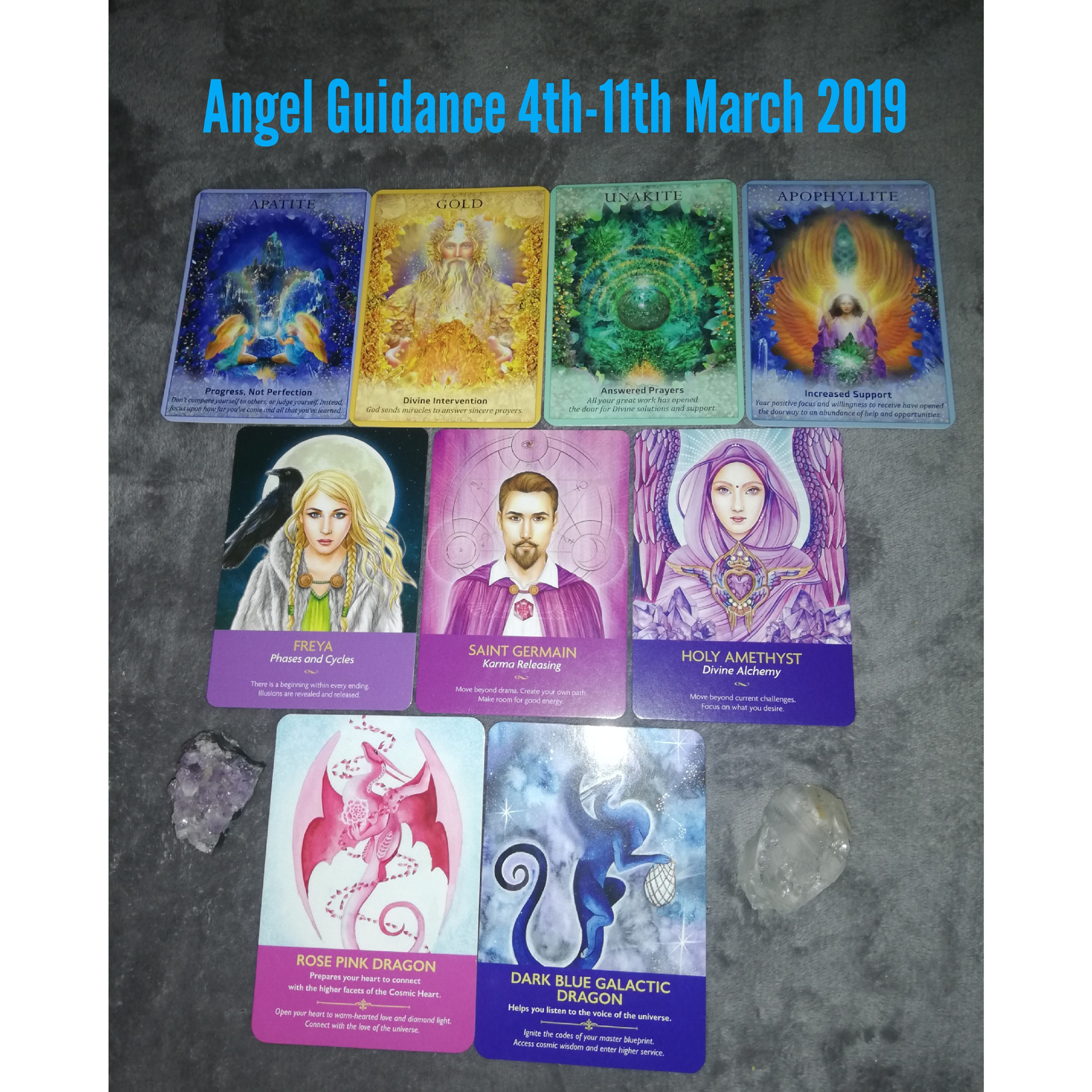 Angel Guidance for the week ahead 4th-11th March 2019. So we are now into the first week of March which marks the coming if spring and new energy. Although it might not feel like this just yet as you may be still be doing some releasing work on old habits , relationships ect, that are no longer in alignment with your highest good, true self, new chapter and soul mission. With this we are making room to embody more levels of light , abundance and opportunities. Also coming up this week surrender , release , rebirth. Opportunities are presented this week that may seem big or scary. Trust that these blessings and opportunities are fully in alignment with your true self and will help your souls growth and soul mission. As ever we do have a amazing spread to help with these frequency's. Archangels Zadkiel his twin flame Holy Amethyst and Saint Germain has come up so strong this week for this reading and the New Moon in Pisces on the 6th, with their amazing powerful Violet flame of transmutation of karma and anything that no longer serves you. Enjoy beautiful souls Love & Light