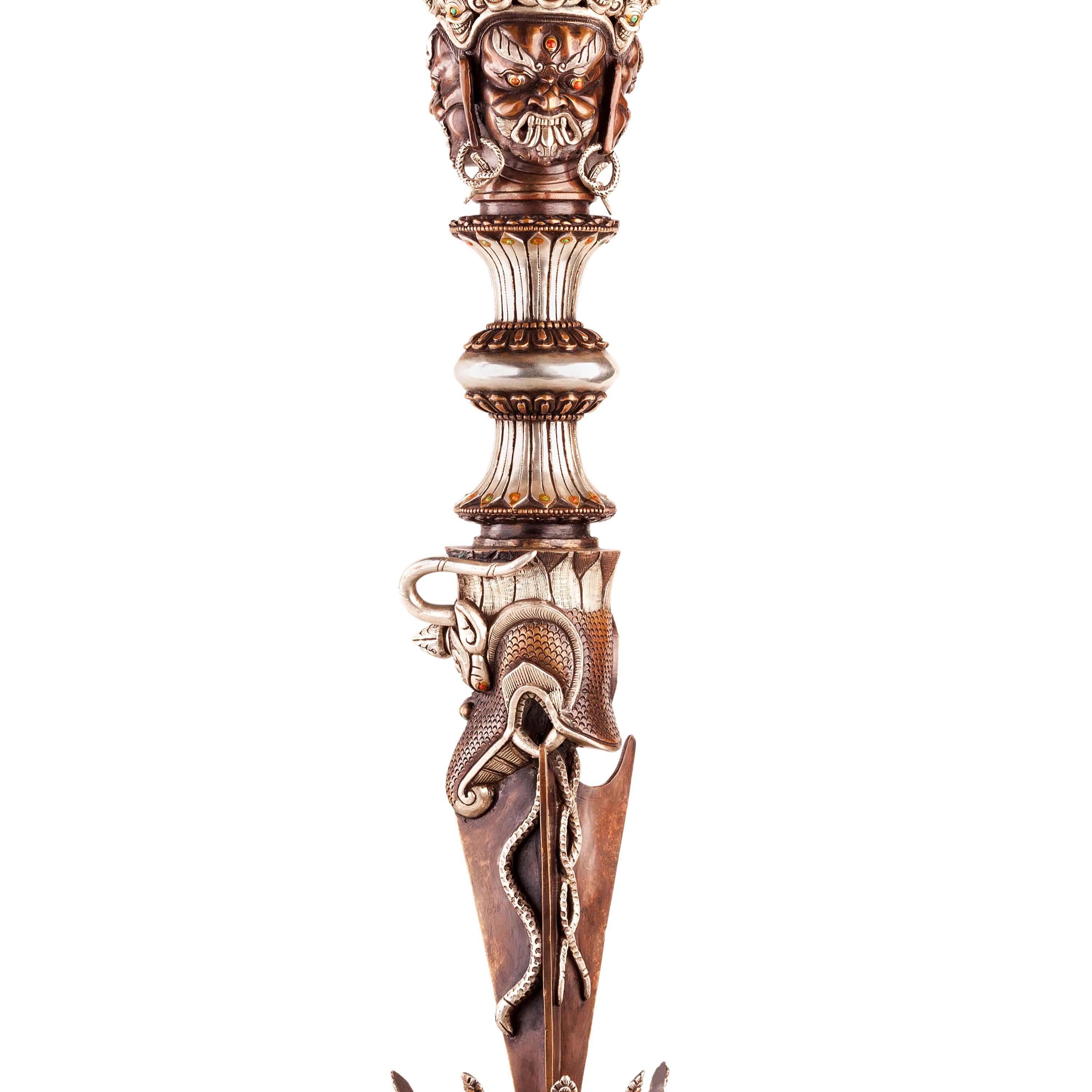 Padmasambhava was one of three incarnated beings who helped to establish Buddhism in Tibet. He is known for his esoteric abilities and qualities. His spiritual partner, Yeshe Tsogyal, is the embodiment of the Divine Feminine in a compassionate and wise form. Vajrakilaya is a wrathful and fierce divine form of compassion and was the main deity practice of Padmasambhava.