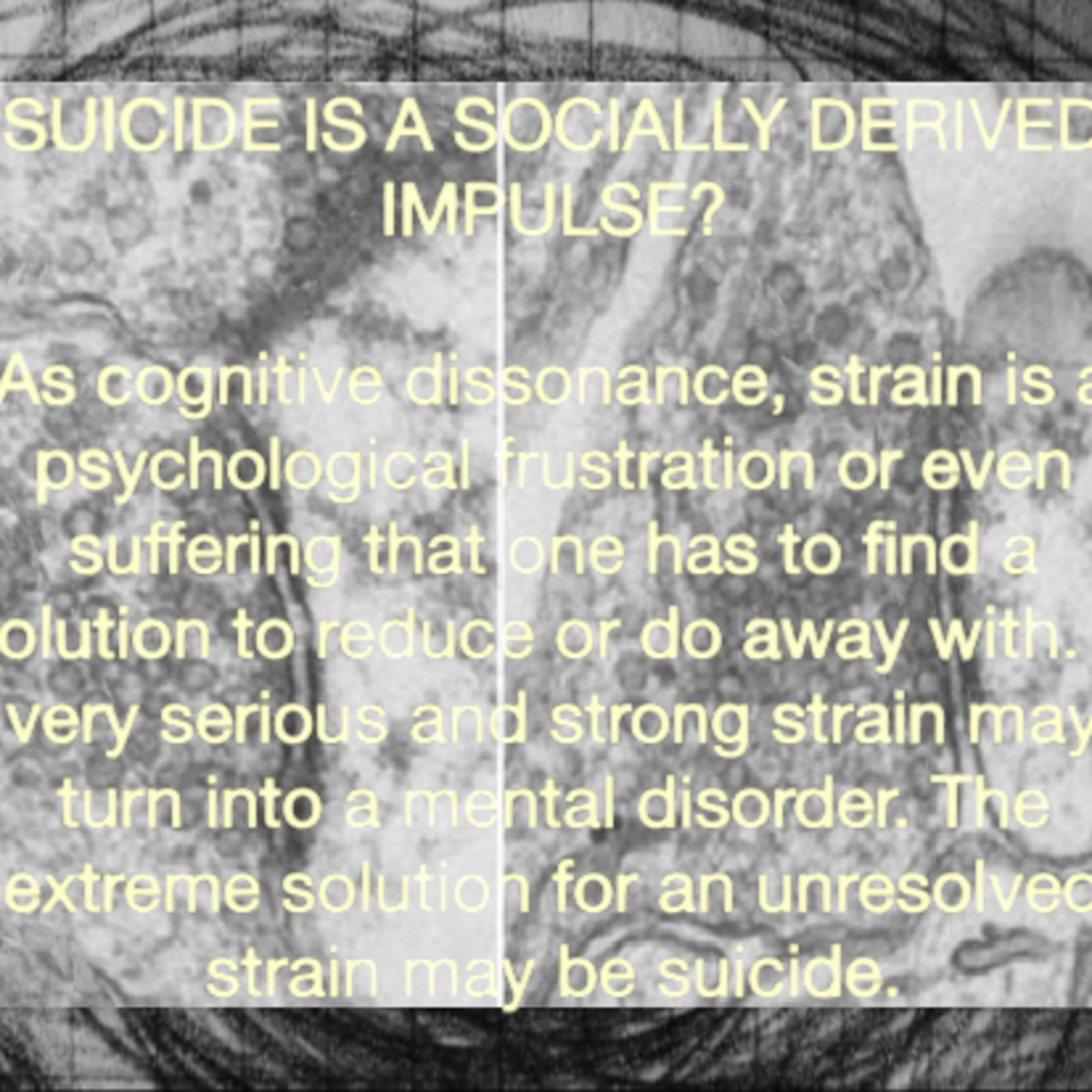 As cognitive dissonance, strain is a psychological frustration or even suffering that one has to find a solution to reduce or do away with. A very serious and strong strain may turn into a mental disorder. The extreme solution for an unresolved strain may be suicide.