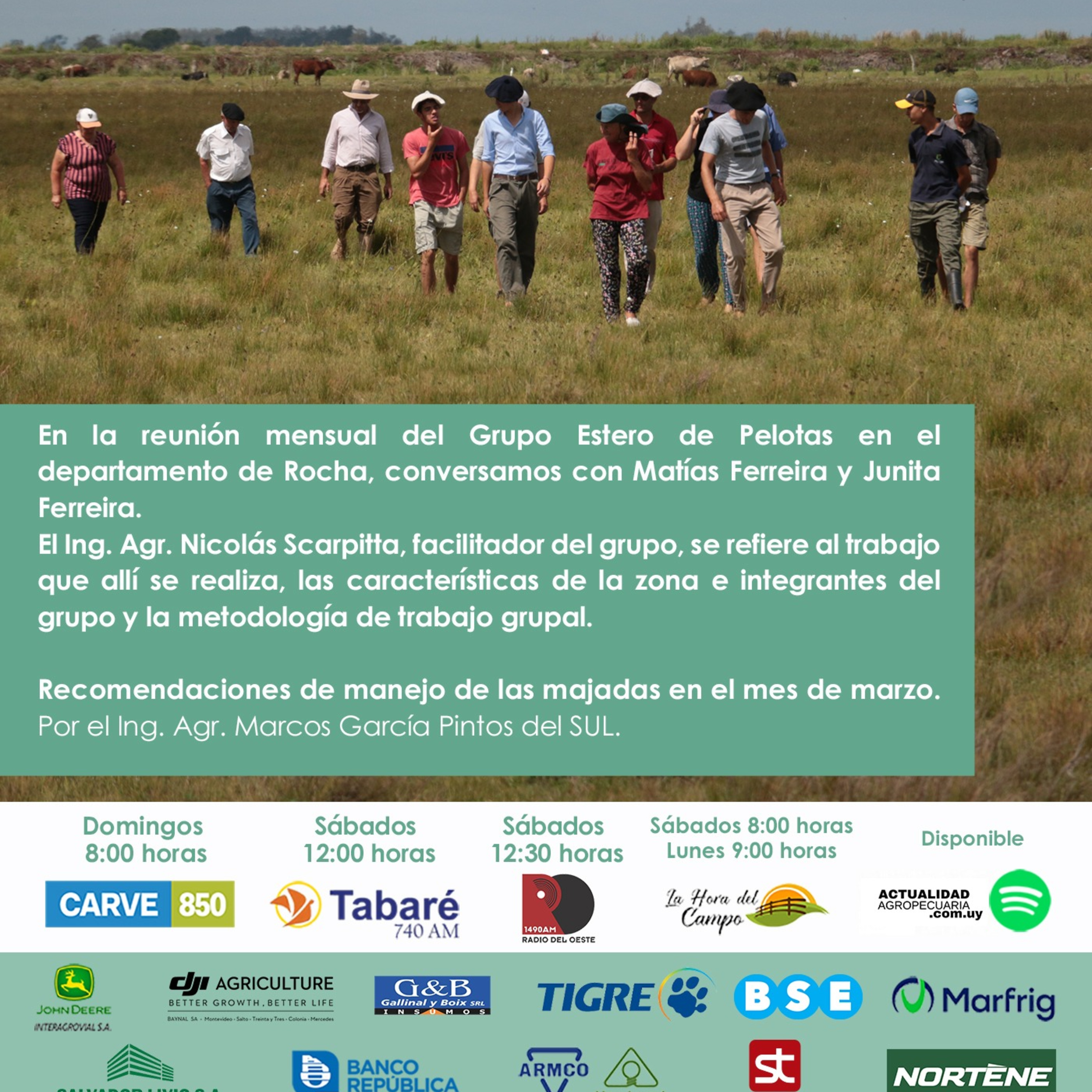 En la reunión mensual del Grupo "Estero de Pelotas" en el Departamento de Rocha, conversamos con Matías y Juanita Ferreira. El Ing. Agr. Nicolás Scarpitta, facilitador del grupo, se refiere al trabajo que allí se realiza, las características de la zona e integrantes del grupo y la metodología de trabajo grupal. Recomendaciones de manejo de las majadas en el mes de marzo. Por el Ing. Agr. Marcos García Pintos del SUL.