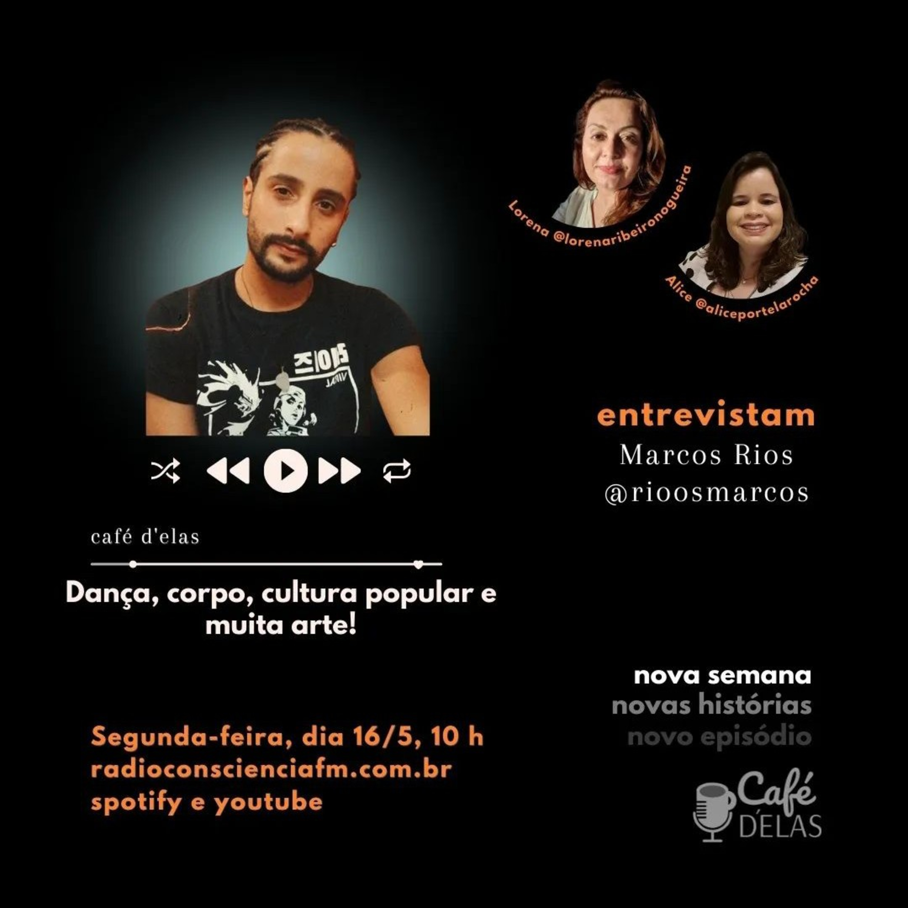 Pós-graduado em 'Dança e Consciência Corporal', Marcos é diretor e coreógrafo do Grupo Calangos de manifestações folclóricas e diretor do Rios Studio de Danças e vai contar pra gente um pouco sobre sua trajetória nas artes e planos futuros.