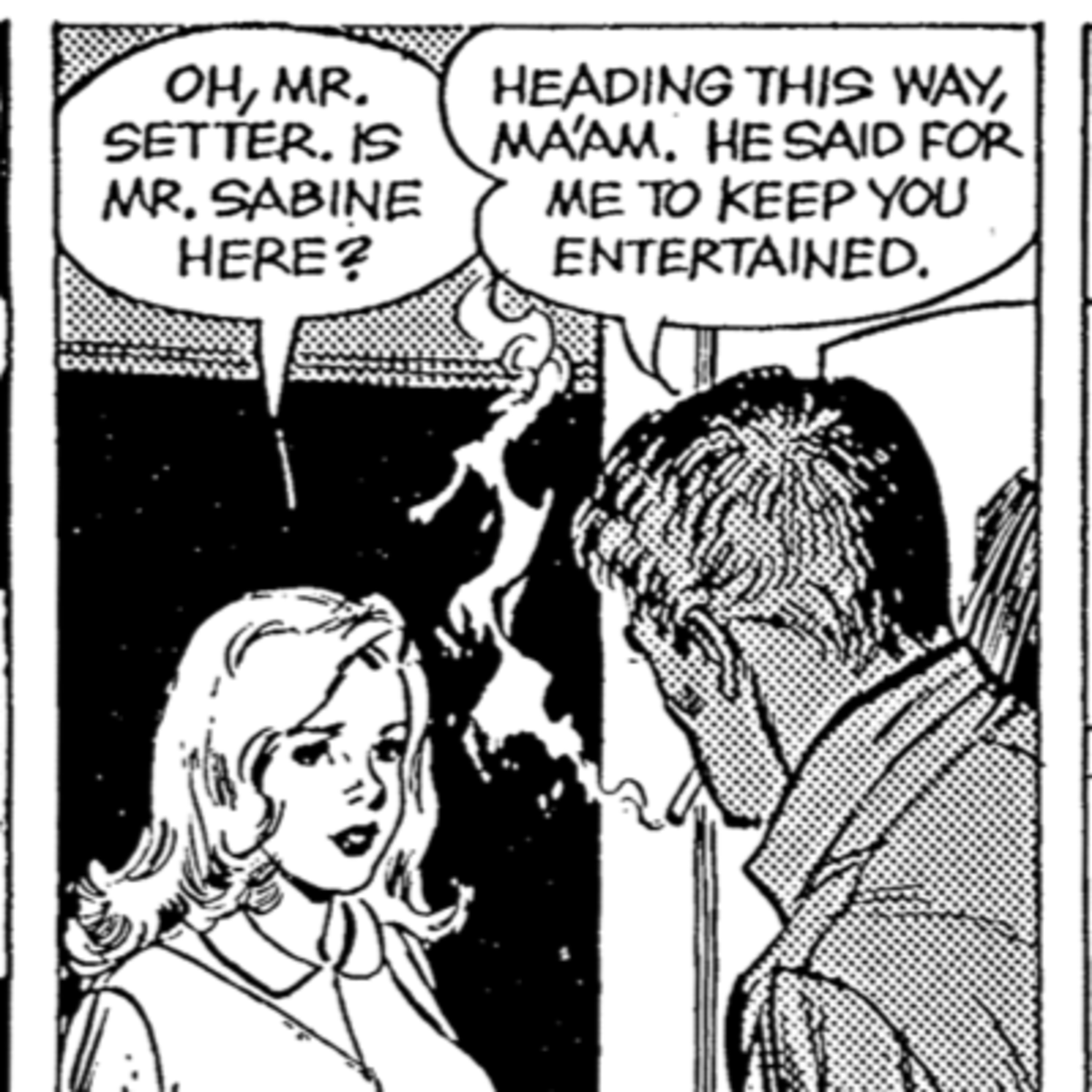 “Oh, Mr. Setter,” she gasped, retreating into her shy persona. “Is Mr. Sabine here?”