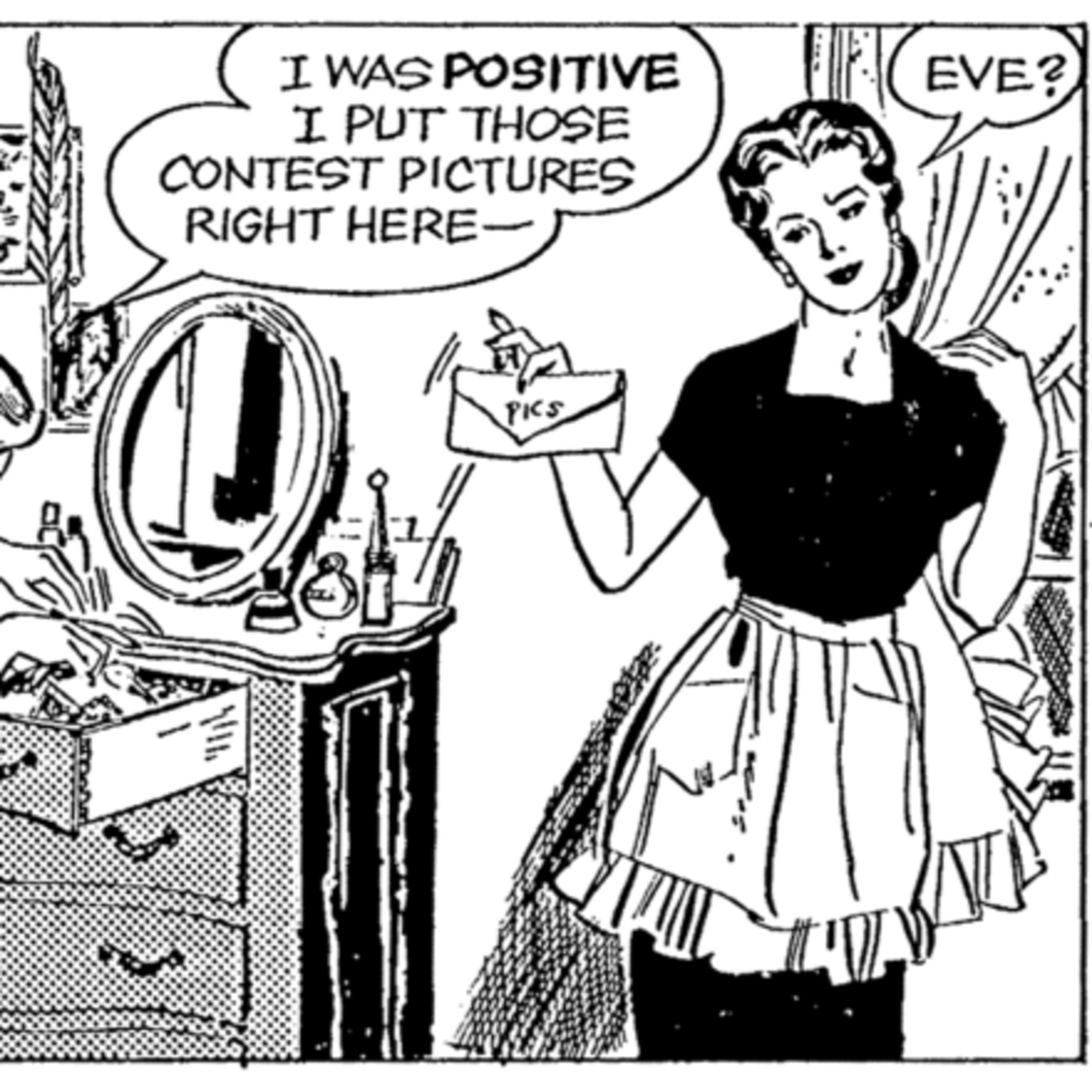 Description: Rummaging through every drawer in her room, Eve searches for the envelope with the pictures that she submitted to the Miss Teenager contest. About to go berserk, she looks up and there, in the hand of her sister Julie, is the envelope.