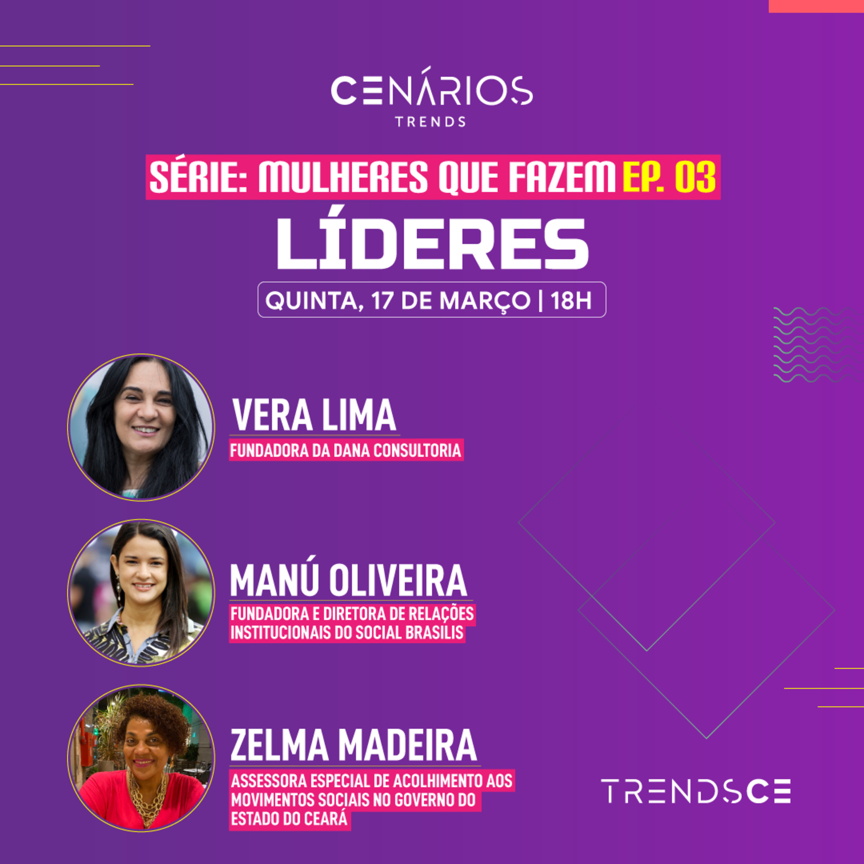 Neste novo programa trazemos convidadas da área de liderança. Participam da conversa Vera Lima, fundadora da Dana Consultoria; Manú Oliveira, fundadora e diretora de Relações Institucionais do Social Brasilis; e Zelma Madeira, assessora especial de Acolhimento aos Movimentos Sociais no Governo do Estado do Ceará.