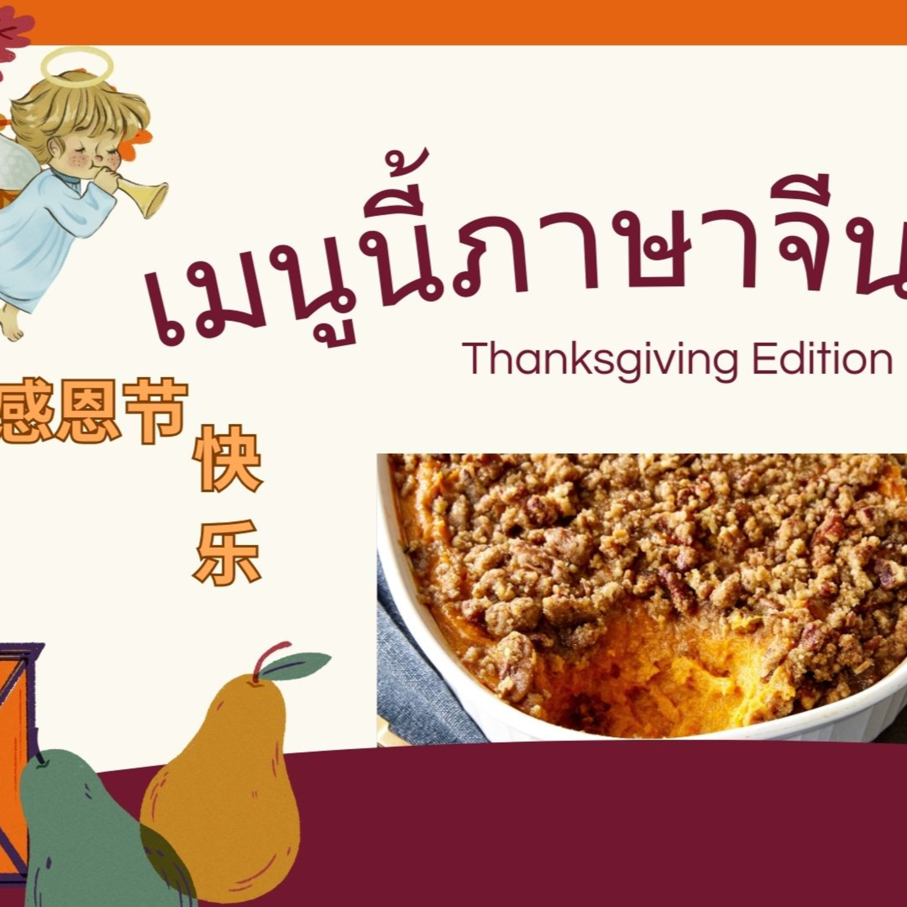 ต้อนรับเทศกาลสำคัญในเดือนนี้ด้วยเมนูที่รับประทานกันในวันขอบคุณพระเจ้า หรือ Thanksgiving Day ทานให้อร่อยไปพร้อมๆ กับการฝึกเรียกเมนูฝรั่งเป็นภาษาจีนกันค่ะ