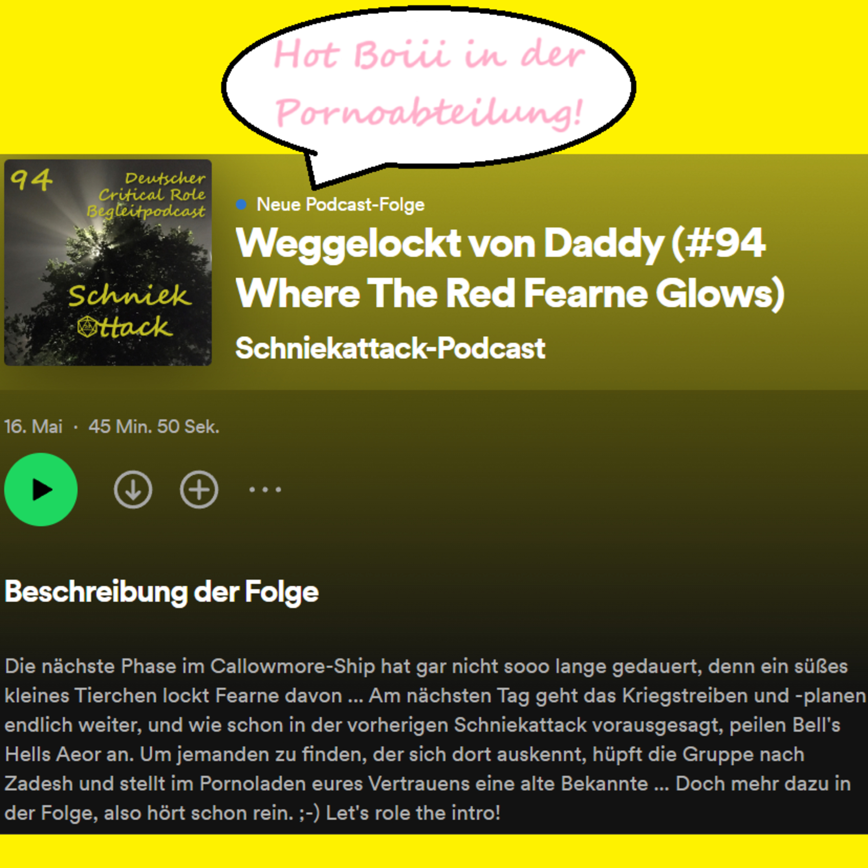 Die nächste Phase im Callowmore-Ship hat gar nicht sooo lange gedauert, denn ein süßes kleines Tierchen lockt Fearne davon ... Am nächsten Tag geht das Kriegstreiben und -planen endlich weiter, und wie schon in der vorherigen Schniekattack vorausgesagt, peilen Bell's Hells Aeor an. Um jemanden zu finden, der sich dort auskennt, hüpft die Gruppe nach Zadesh und stellt im Pornoladen eures Vertrauens eine alte Bekannte ... Doch mehr dazu in der Folge, also hört schon rein. ;-) Let's role the intro!