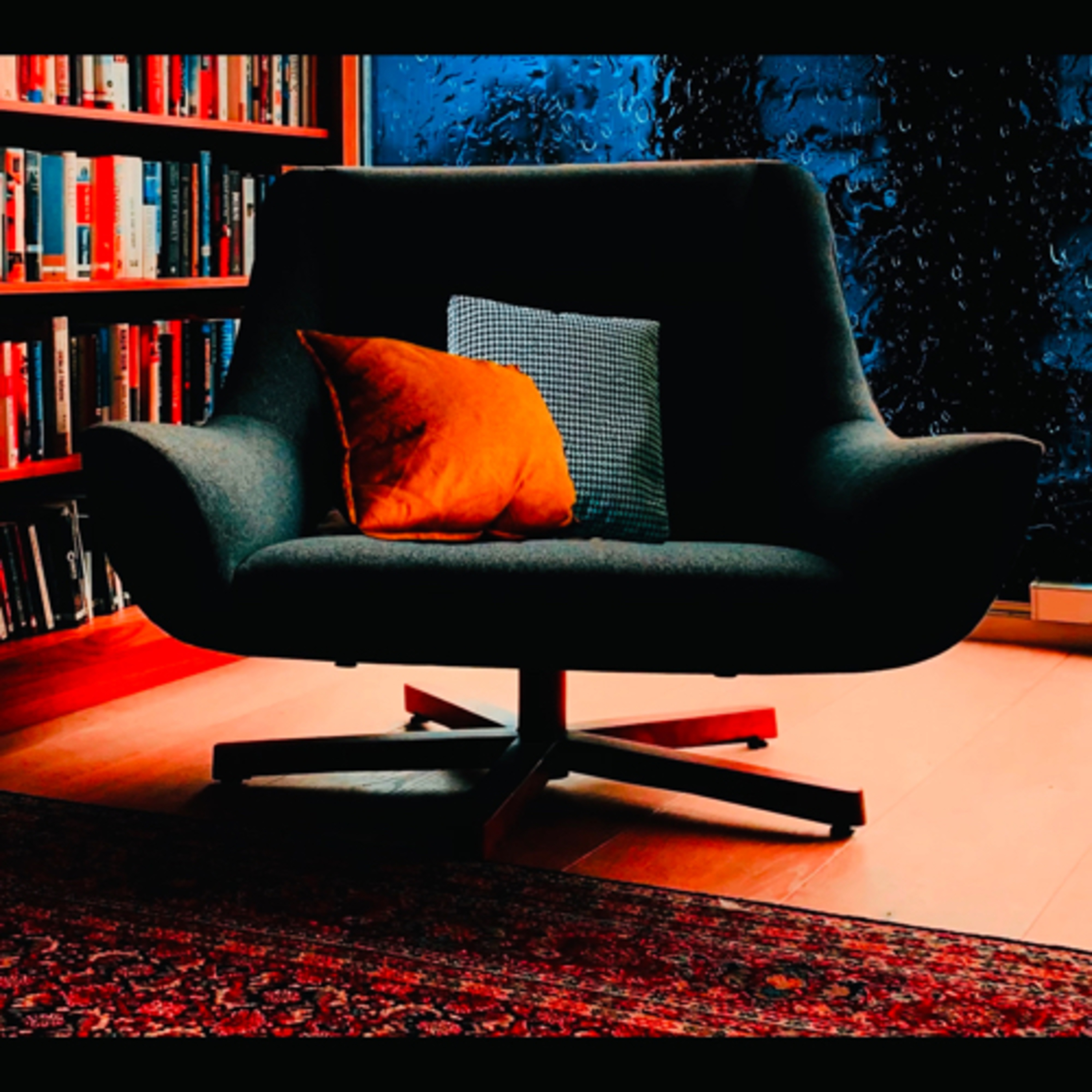 Library study room rain on window fireplace