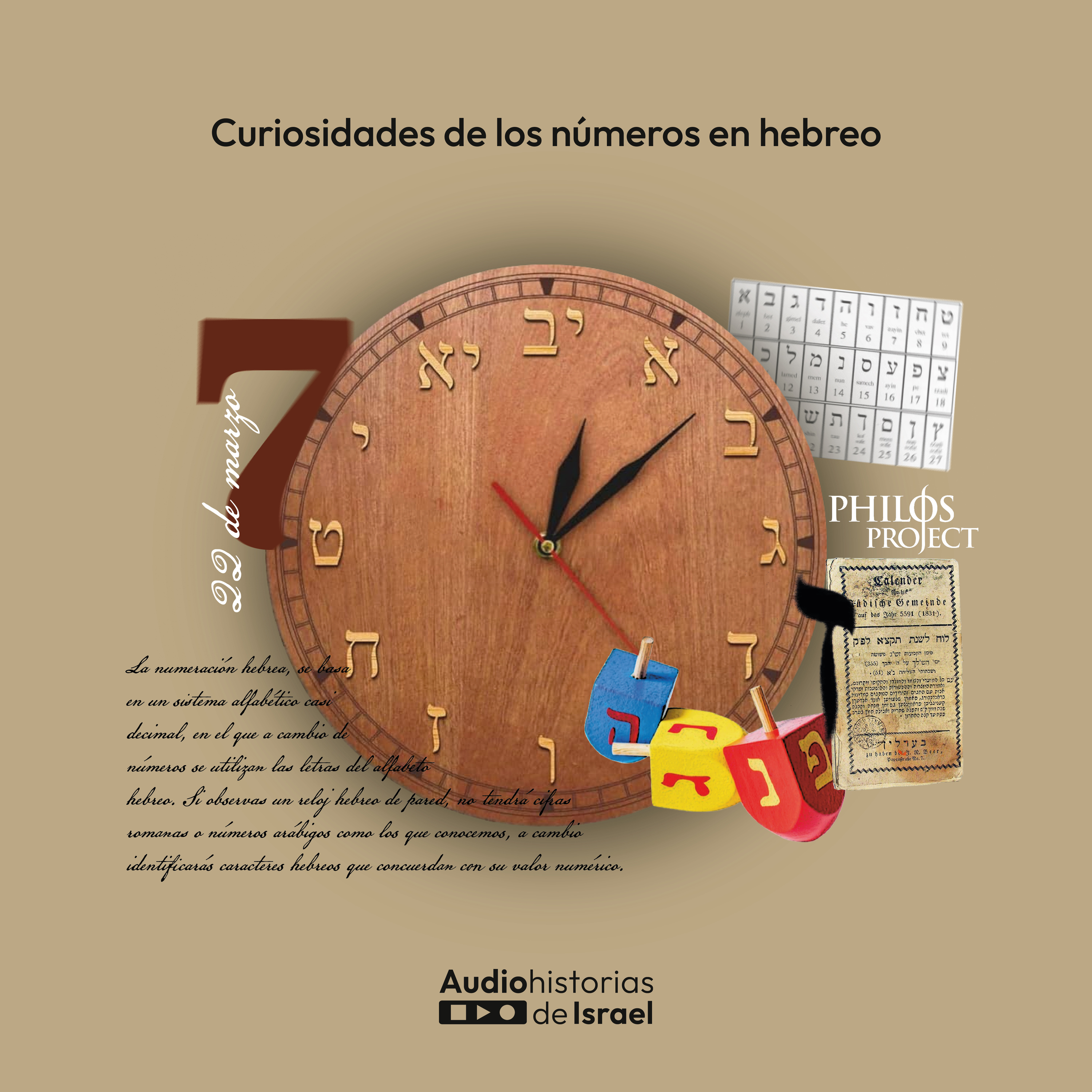 La numeración hebrea, se basa en un sistema alfabético casi decimal, en el que a cambio de números se utilizan las letras del alfabeto hebreo. Si observas un reloj hebreo de pared, no tendrá cifras romanas o números arábigos como los que conocemos, a cambio identificarás caracteres hebreos que concuerdan con su valor numérico. Esto es porque las cifras y los números en hebreo se escriben con letras, y el valor de cada uno corresponde con el orden que ocupan en el alfabeto. Mientras que en occidente usamos los números para indicar la cantidad de algo, para la mentalidad hebrea los números pueden expresar un simbolismo y un mensaje. En el sentido simbólico, expresan una idea, por ejemplo: el número 1 simboliza a Yahvé como único Dios, expresando su exclusividad, preeminencia y soberanía. El número 6 representa imperfección, pecado, o el mal. El número 7 representa la perfección, indicando de forma común que la medida o cantidad está completa o que el resultado está perfecto. Así con muchos de los números, el número 1.000 significa multitud o gran cantidad. Como dato adicional, los números del uno al diecinueve se pueden decir de manera femenina y masculina. Escucha cómo se pronuncian los números de 0 a 10 en hebreo, en forma femenina. Cero: Efes, uno: Achad, dos: Shtaim, tres: Shalosh, cuatro: Arba, cinco: Hamesh, seis: Shesh, siete: Sheva, ocho: Shmone, nueve: Tesha, y diez Eser. Escuchemos cómo repetiría un niño su lección hasta aprenderla. Así se entienden los números desde la comprensión hebrea. Cuéntanos si te parece curioso.