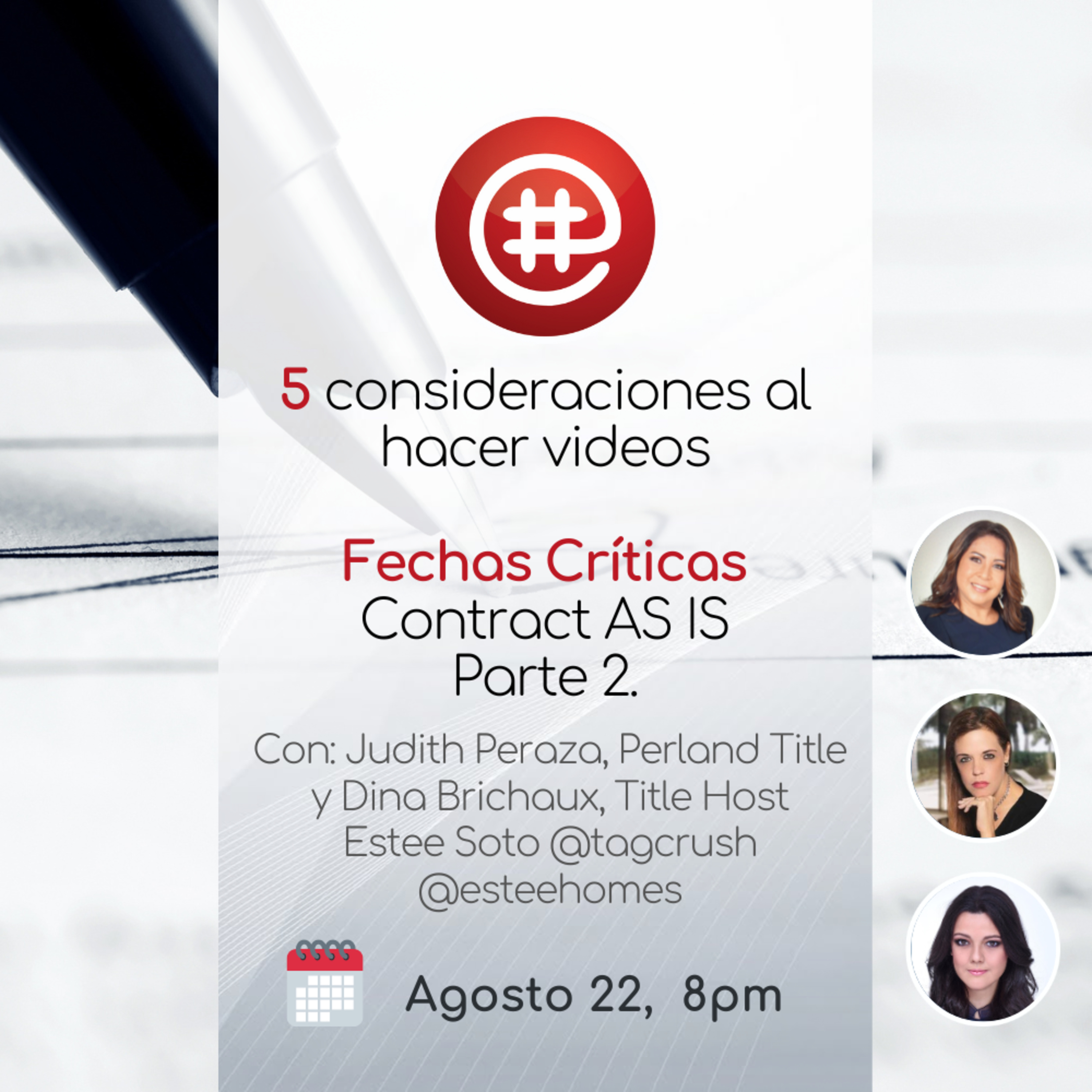 En este Episodio conversaremos con Luis Santiago, sobre los 5 pasos que debes seguir para lograr un video exitoso!. tmabien hablaremos con Judith Peraza de Perland Title, sobre las fechas críticas de un contrato AS IS Parte 2, tema que se hace practicamente obligatorio evaluar despues de la nueva version del contrato en Julio 2023