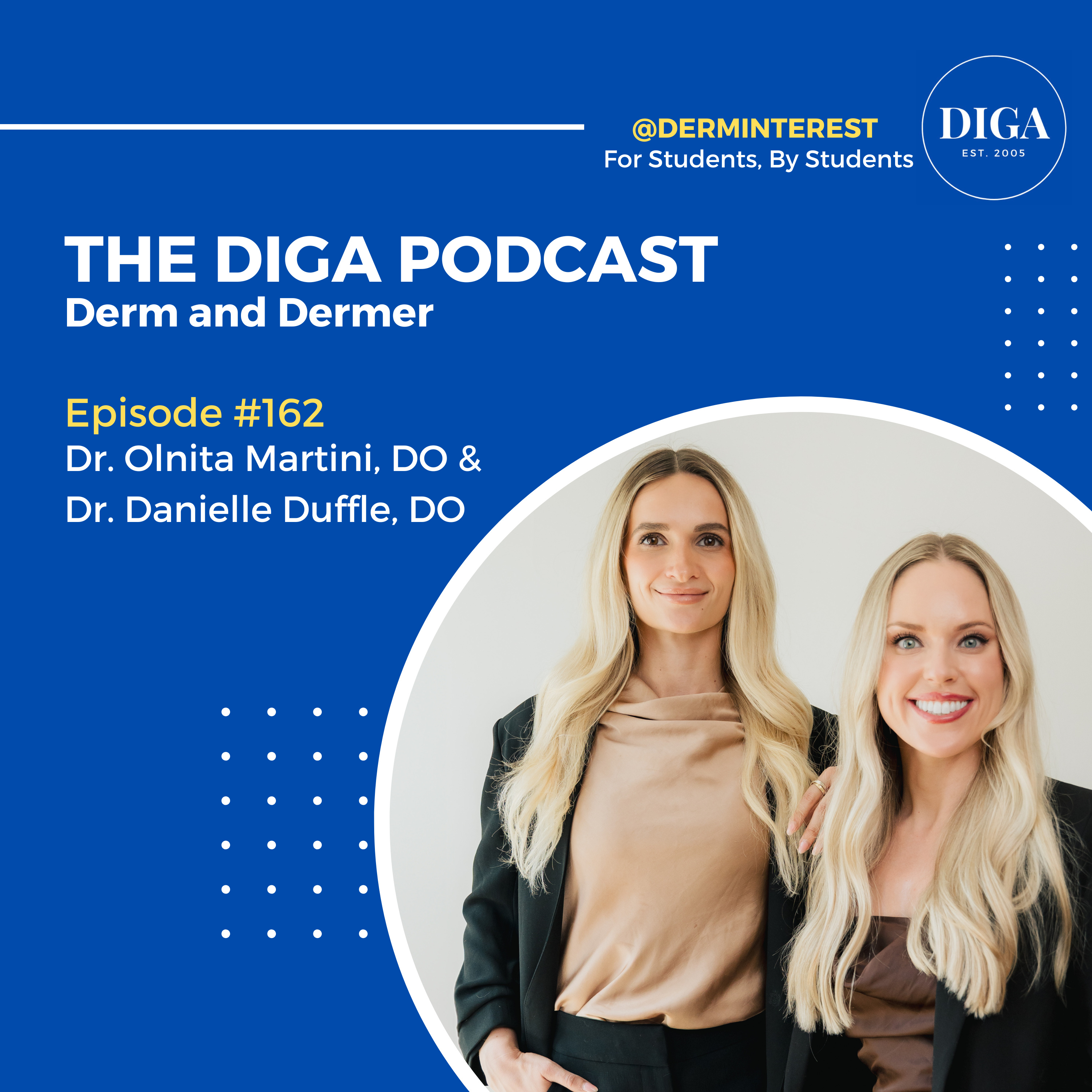 In this episode, we talk with Dr. Olnita Martini, DO, and Dr.Danielle Duffle, DO. Dr. Martini and Dr. Duffle are recent graduates of Rocky Vista University College of Osteopathic Medicine and newly matched dermatology residents. The two began a social media page called Derm and Dermer to spread knowledge about medical school and dermatology and make people laugh along the way. Tune in to hear how it all began from Derm and Dermer themselves! We hope you enjoy!