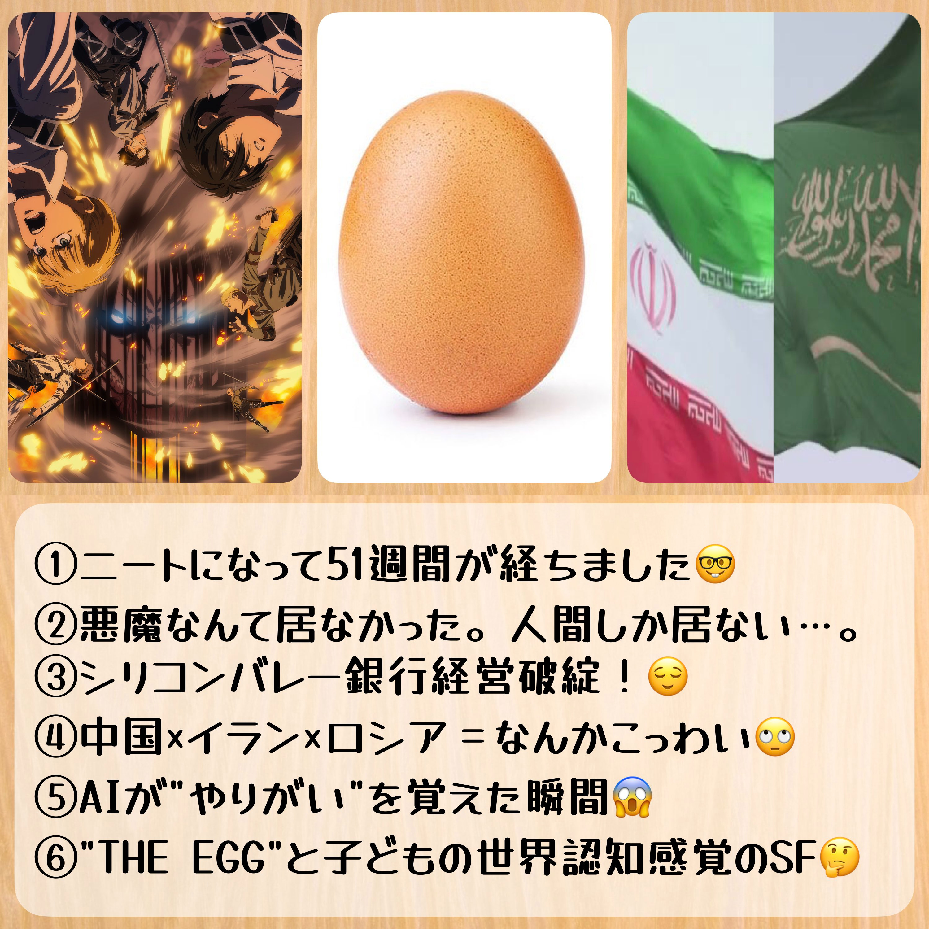 アンディー・ウィアーの短編小説「THE EGG」/全人類は自分の生まれ変わり/全ての幸せ、全ての悲しみを経験する/幼児の認識と似ている?/どこまでが自分で、どこからが他人なのか/理解するために線を引く/バランスを保とうとする地球/食べられるために必要な草食動物/オーストラリアのウサギ戦争/生き物は遺伝子にくっついている塊/利己的な遺伝子/蟻は自己を顧みず公共の利益を優先している?/人を助けることも人類全体の生存戦略になっている/SF脳で考えを飛躍させてみた/すごいオチになった