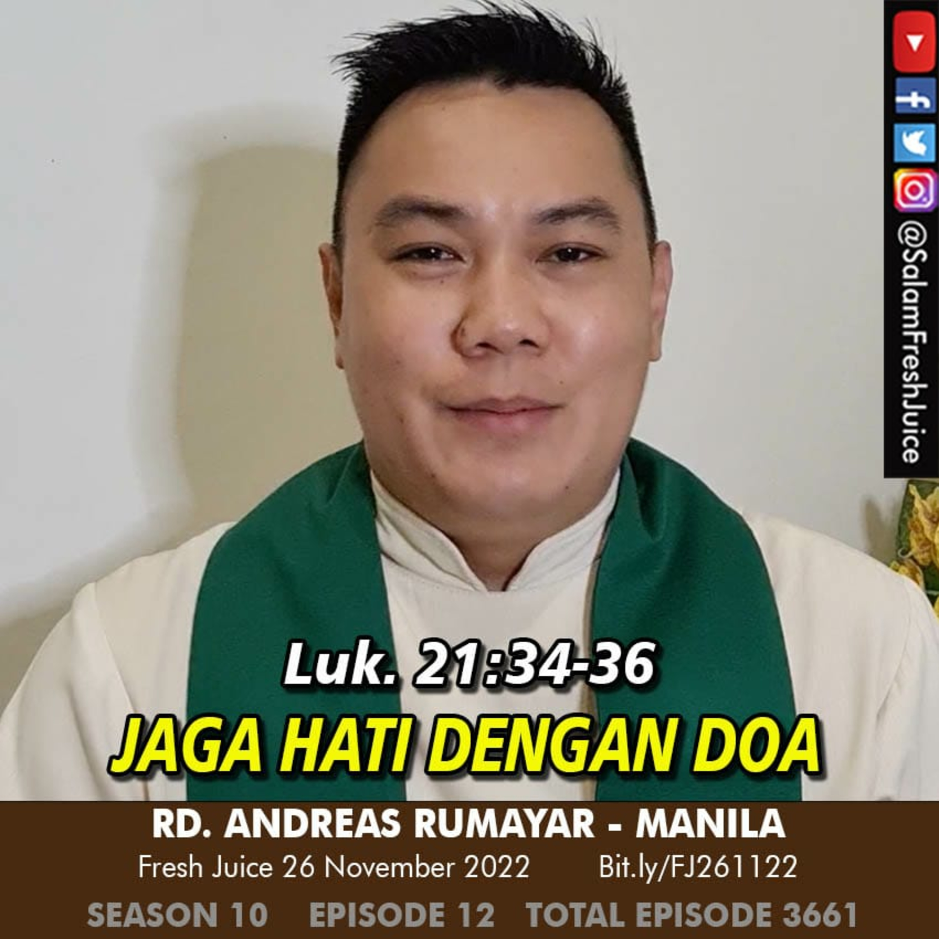 Fresh Juice 26 November 2022 Renungan Harian Audio Katolik Luk. 21: 34 - 36 Tema : Jaga Hati Dengan Doa Pembawa Renungan : RD. Andreas Rumayar - Manila