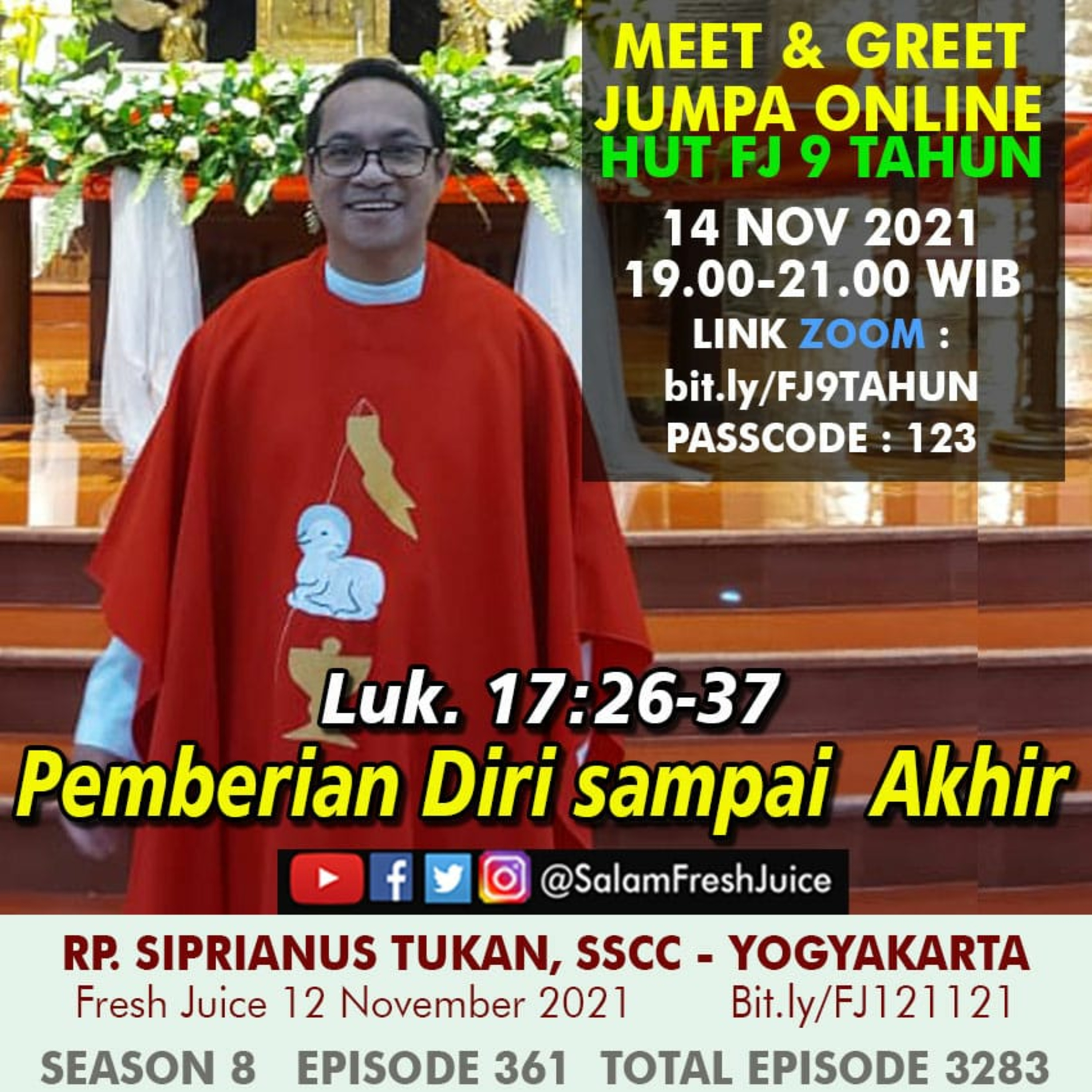 Fresh Juice 12 November 2021 Renungan Harian Audio Katolik Luk. 17 : 26-37 Tema : Pemberian Diri Sampai Akhir Pembawa Renungan : RP. Siprianus Tukan, SSCC - Yogyakarta
