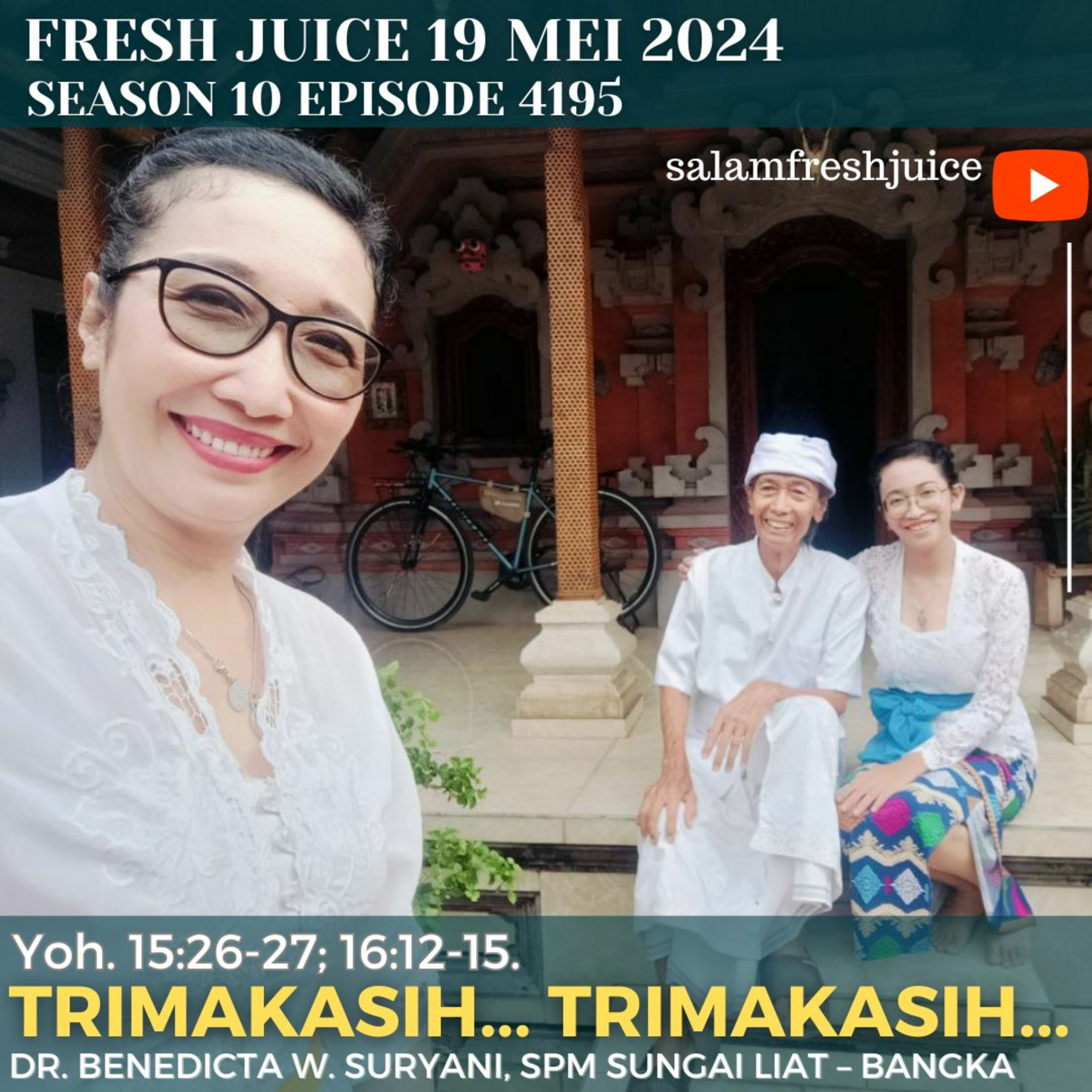 Fresh Juice 19 Mei 2024 Renungan Harian Audio Katolik Yoh. 15 : 26 - 27 ; 16 : 12 - 15 Tema : Trimakasih...Trimakasih... Pembawa Renungan : Dr. Benedicta W. Suryani ,SpM - Sungailiat, Bangka
