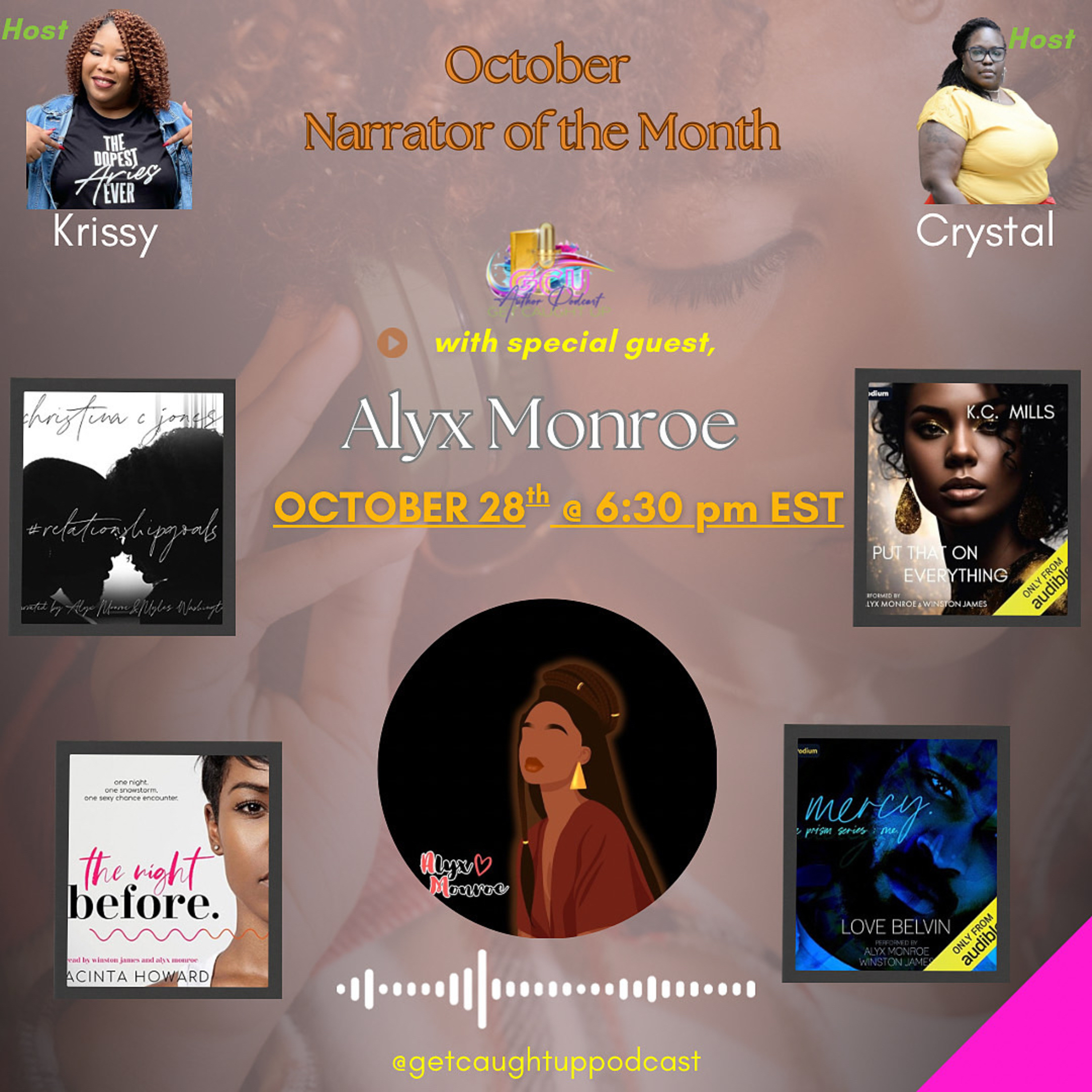 Join us LIVE on October 28th at 6:30 pm EST as we sit down with this passionate storyteller who voices our Black romances down! Join us as we dive into her catalog and GET CAUGHT UP on the world of Alyx Monroe. October just got steamy.