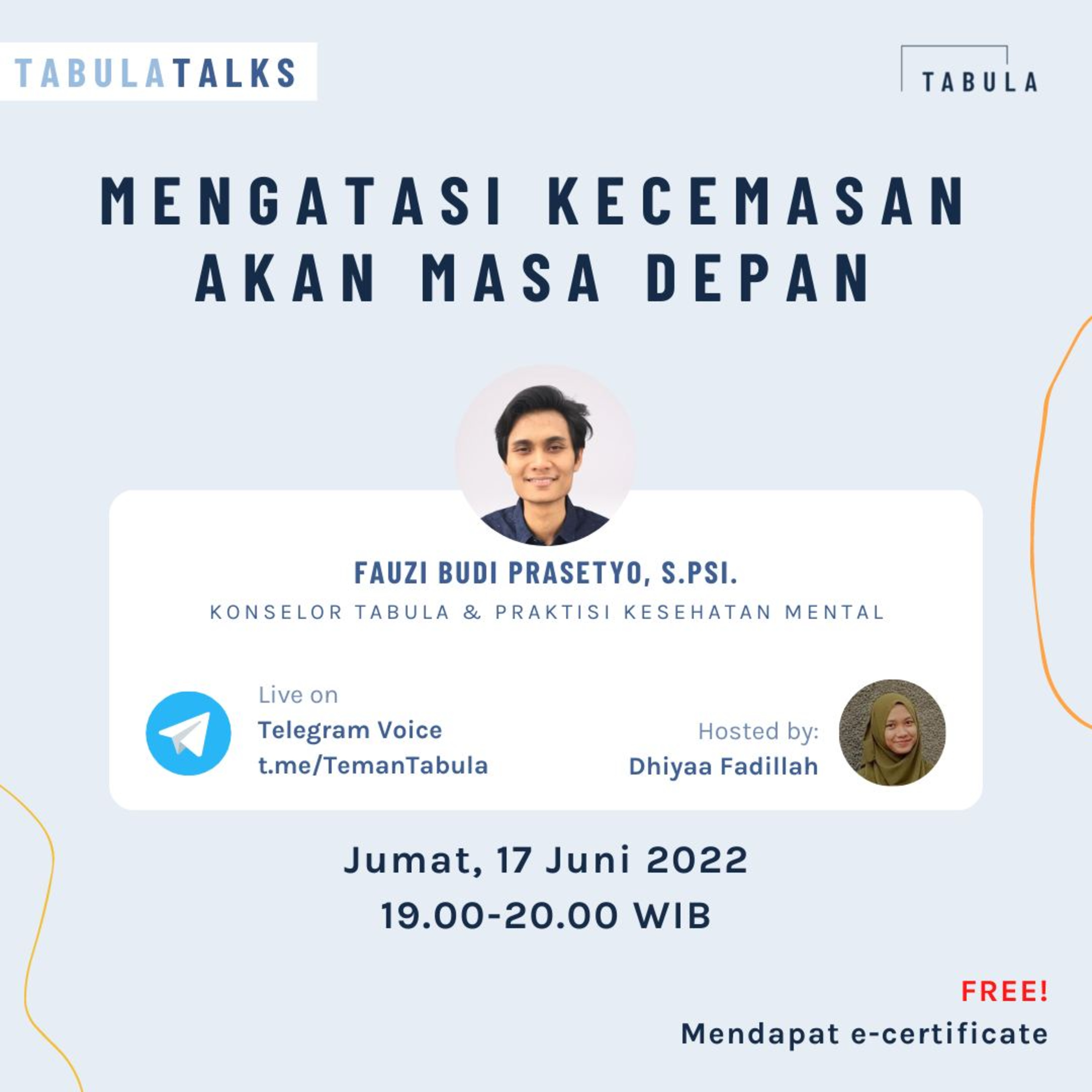 Yuk kita sharing bersama kak Fauzi, konselor Tabula yang juga pernah mengalami kecemasan yang sama! :) Kita akan sharing bersama mengenai cara menghadapi dampak negatif dari kecemasan akan masa depan.