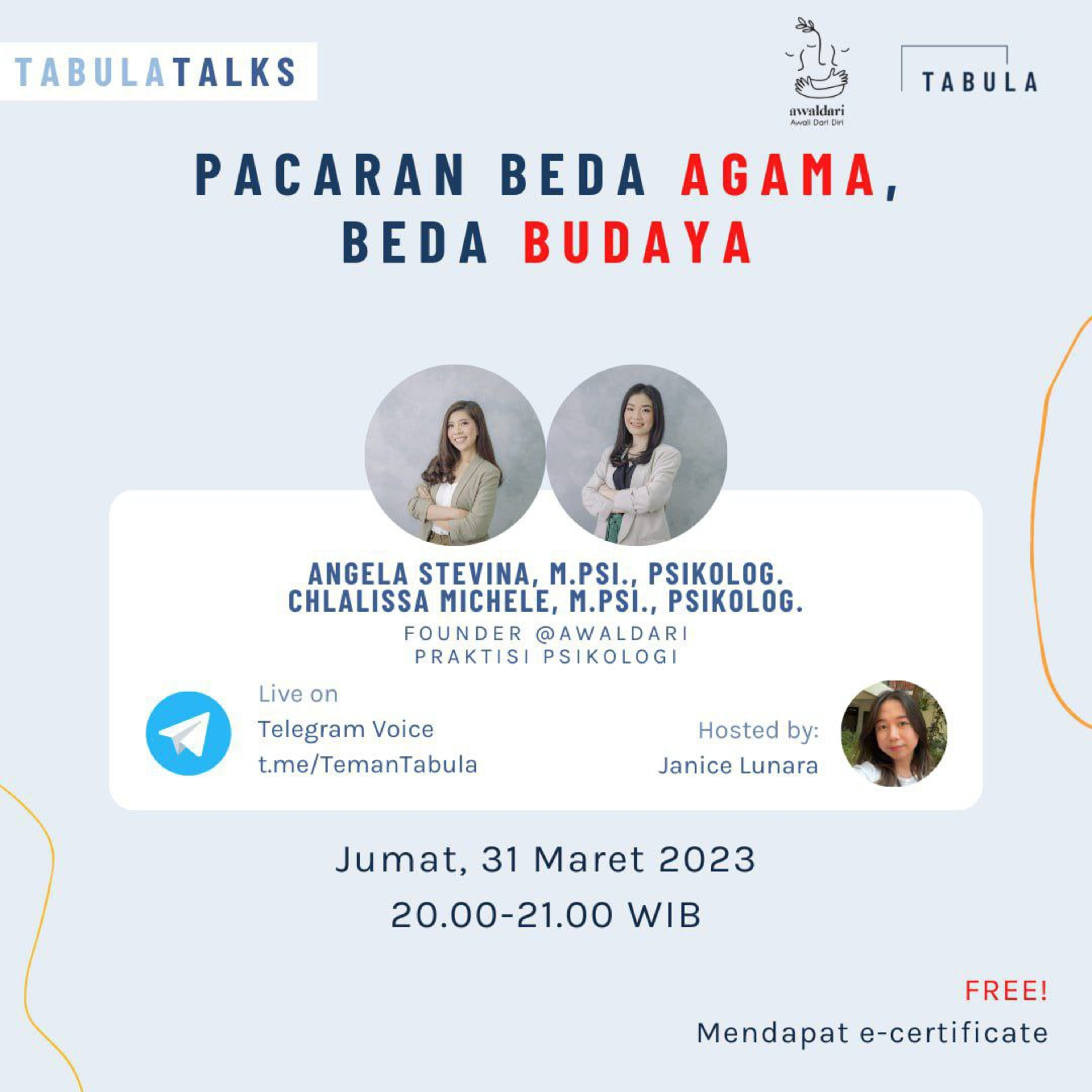 Daripada bingung, yuk, join TabulaTalks yang akan dibawakan oleh Kak Stevina dan Kak Michele. Akan ada banyak insight menarik yang bisa Teman Tabula dapatkan.