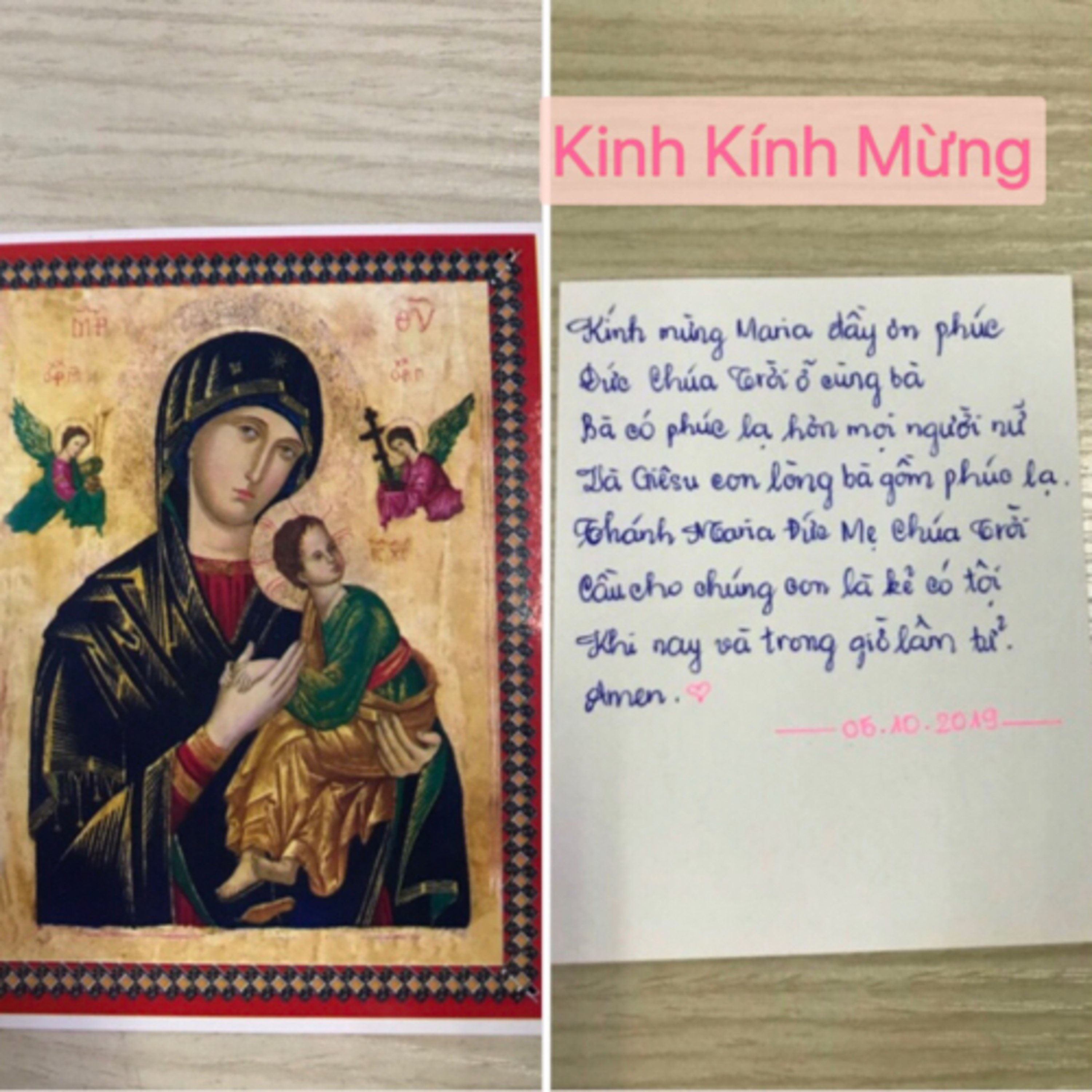 Kính mừng Maria đầy ơn phúc, Đức Chúa Trời ở cùng Bà, Bà có phúc lạ hơn mọi người nữ, và Giêsu con lòng Bà gồm phúc lạ. Thánh Maria Đức Mẹ Chúa Trời, cầu cho chúng con là kẻ có tội khi nay và trong giờ lâm tử. Amen 💝