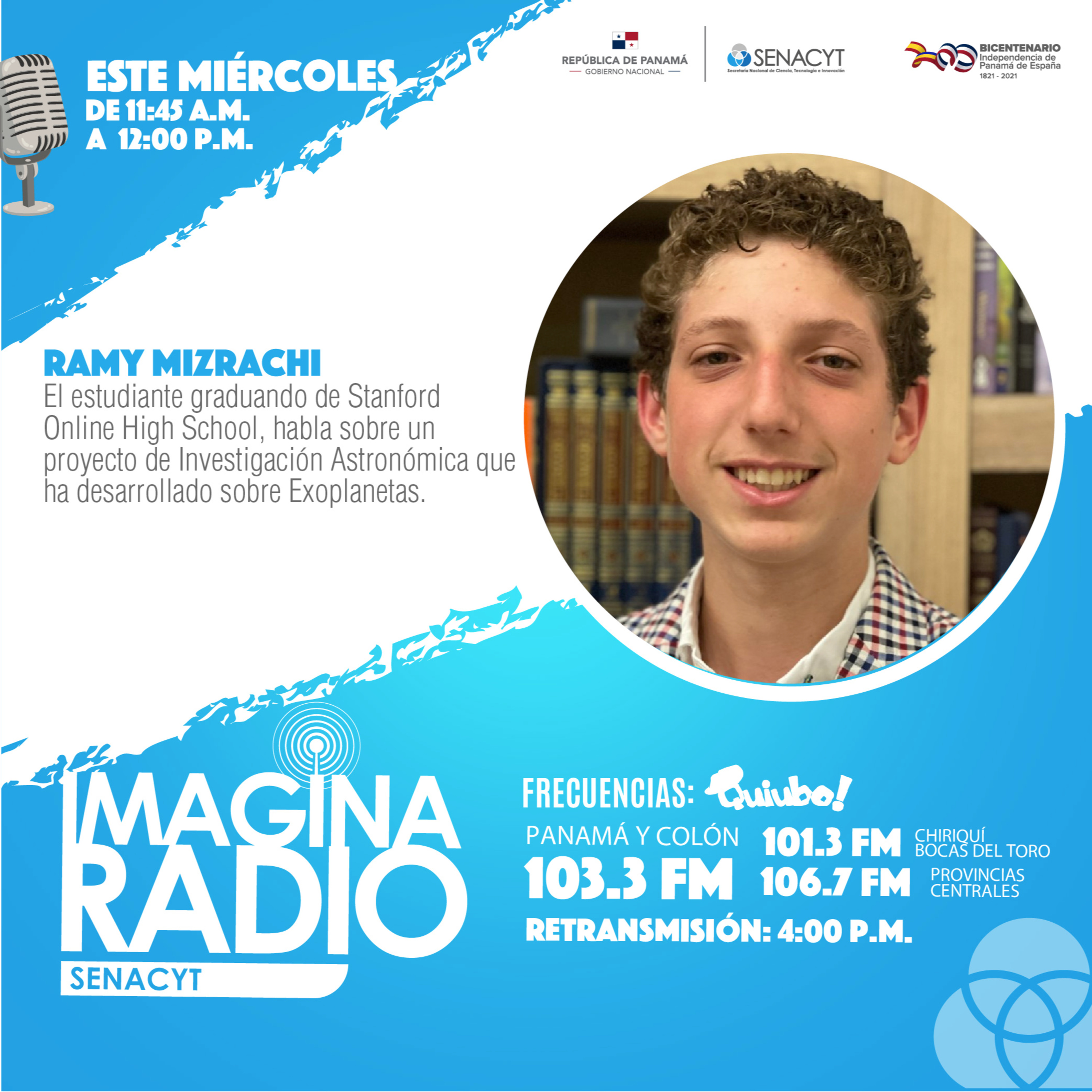 Te invitamos a sintonizar el Programa de Radio IMAGiNA de la Secretaría Nacional de Ciencia, Tecnología e Innovación (SENACYT), de lunes a viernes, a las 11:45 a.m. y su retransmisión a las 4:00 p.m. por Quiubo Estéreo 103.3 FM. Entérate de las últimas noticias en ciencia, salud, educación, emprendimiento, agro, tecnología y mucho más. ¡Ciencia y tecnología para mi gente!