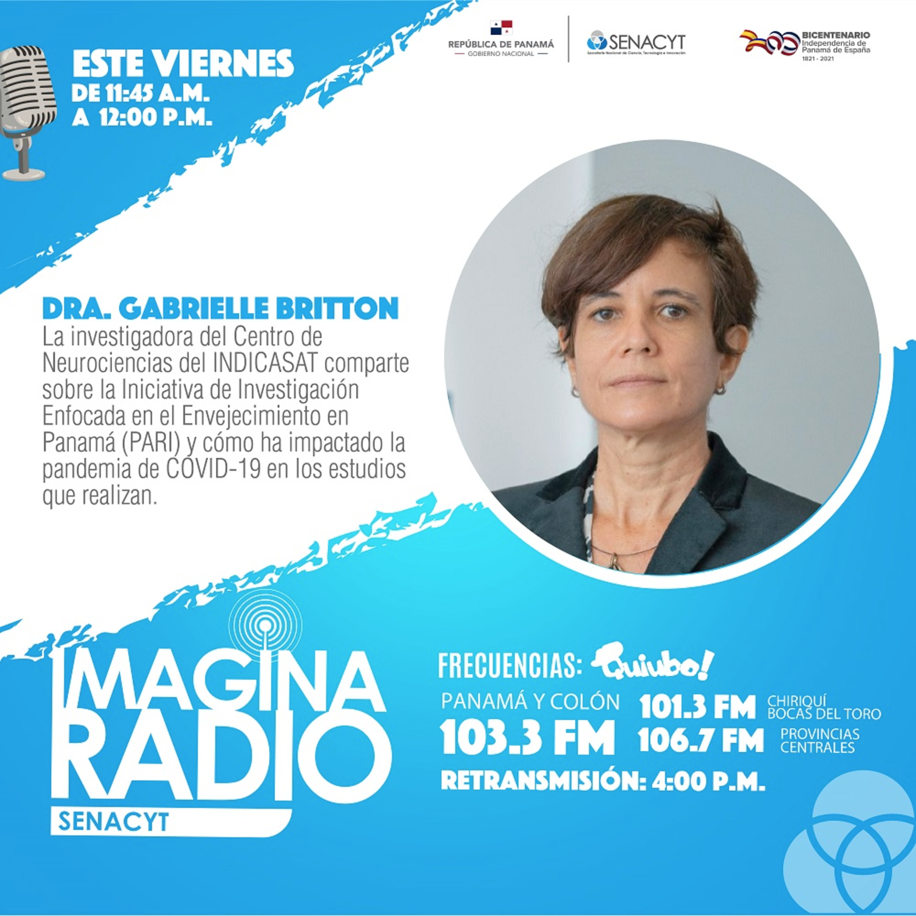 Te invitamos a sintonizar el Programa de Radio IMAGiNA de la Secretaría Nacional de Ciencia, Tecnología e Innovación (SENACYT), de lunes a viernes, a las 11:45 a.m. y su retransmisión a las 4:00 p.m. por Quiubo Estéreo 103.3 FM. Entérate de las últimas noticias en ciencia, salud, educación, emprendimiento, agro, tecnología y mucho más. ¡Ciencia y tecnología para mi gente!