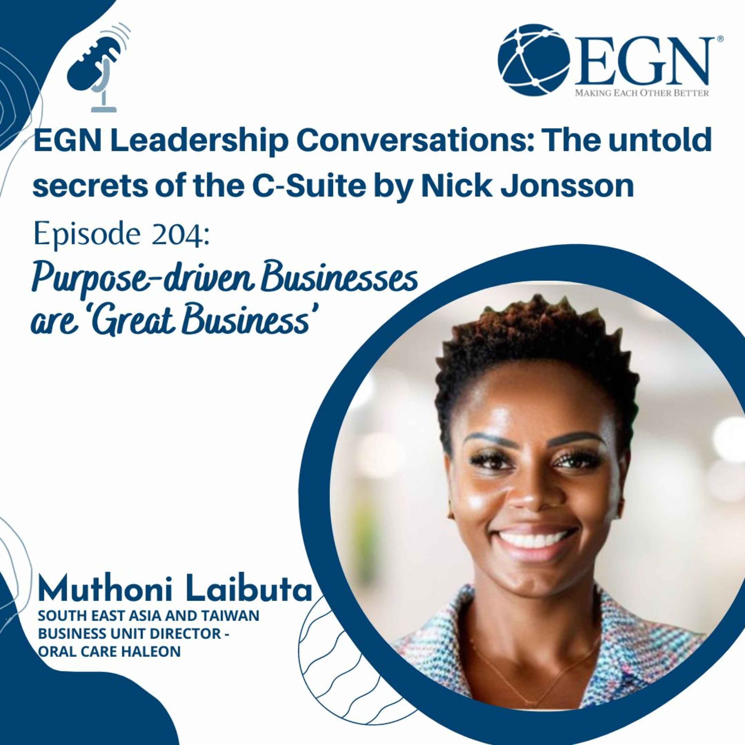 This is episode #204 of EGN Leadership Conversations: The untold Secrets of the C-Suite by Nick Jonsson and we are pleased to have with us Muthoni Laibuta, South East Asia and Taiwan Business Unit Director - Oral Care Haleon, sharing her insight on purpose-driven businesses are ‘Great Business’.