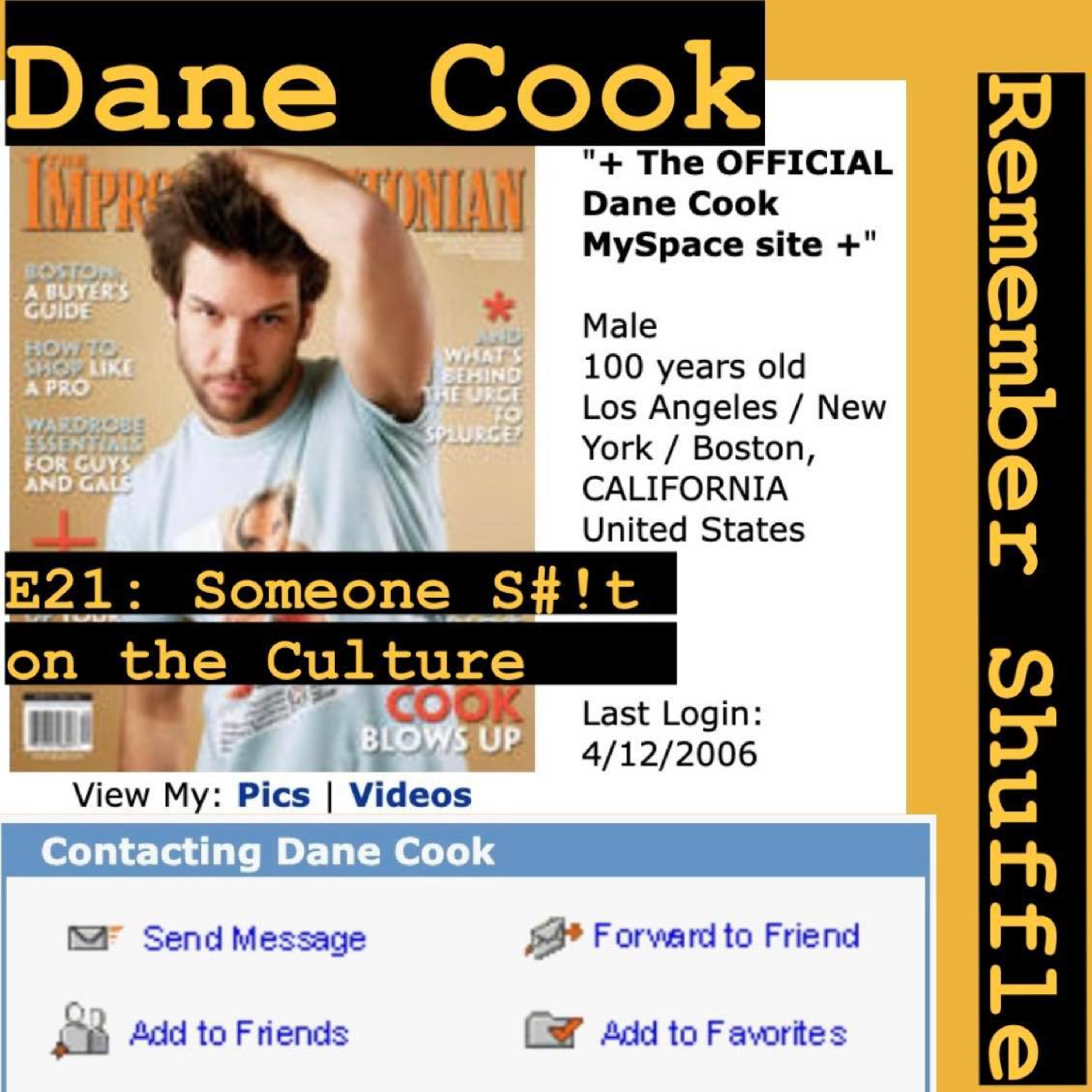 NOTE: SORRY--we had to reupload this one due to an audio issue--THIS EPISODE IS OLD AND FROM Jan 2024. Remember Shuffle turns to the world of stand-up comedy and does a career retrospective of Dane Cook and and album review of his 2005 album “Retaliation.” En route, they break down the internal logic of his jokes, catalogue Dane Cook’s style, and do a bit of armchair psychiatry on everyone’s favourite man-child comedian.