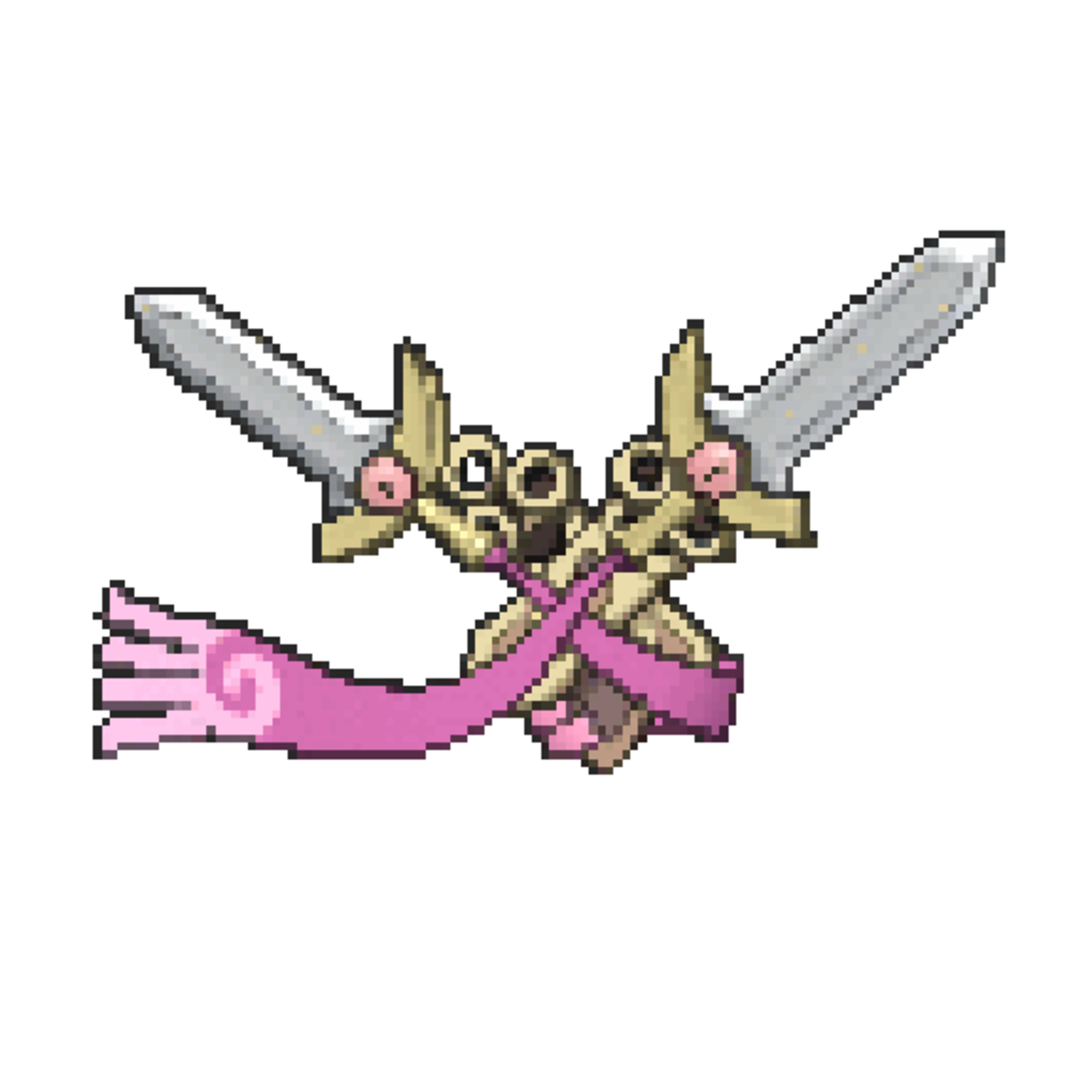Honedge evolves into twins. The two blades rub together to emit a metallic sound that unnerves opponents.