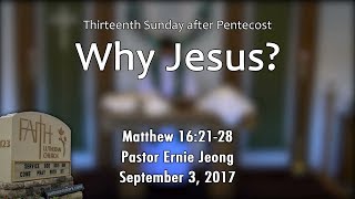 9/3/2017 -- Matthew 16:21-28 -- Pastor Ernie Jeong https://youtu.be/11BjaG9JP4U Thirteenth Sunday after Pentecost Scripture Readings Jeremiah 15:15-21 Psalm 26 Romans 12:9-21 Matthew 16:21-28