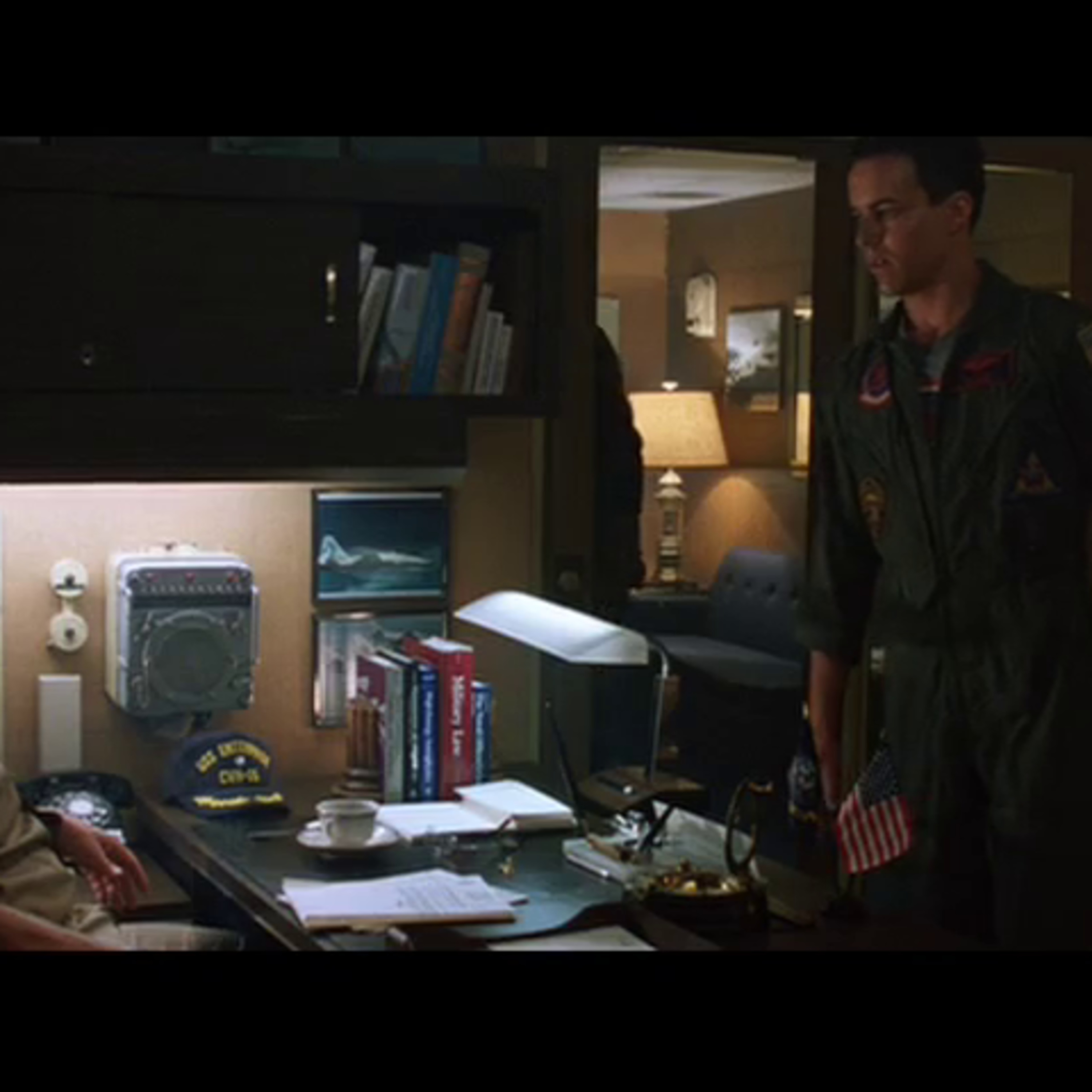 Cougar explains his emotions to Stinger but ultimately turns in his wings. Maverick and Goose enter Stinger's office and gets a verbal reprimand.