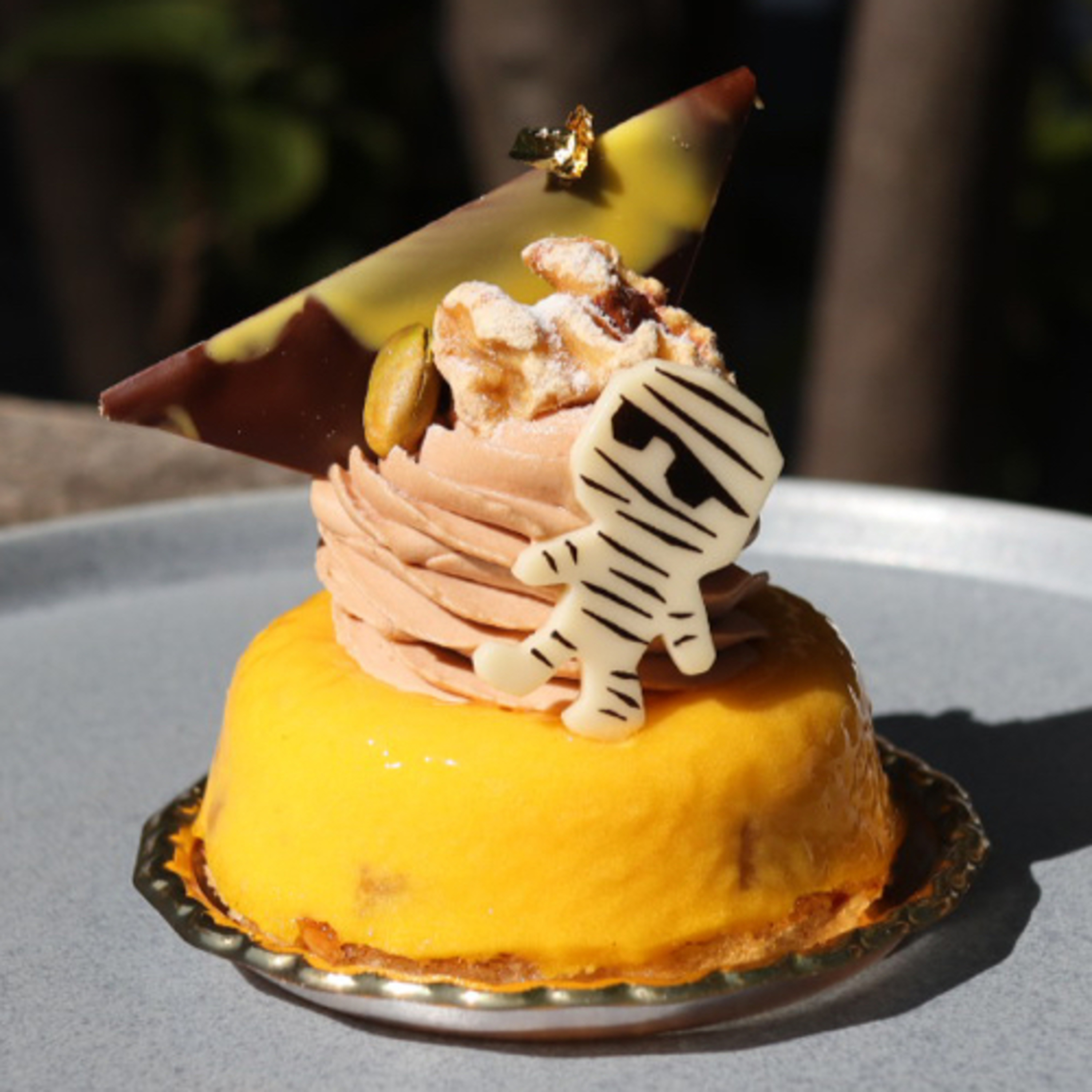 ケーキ名:Halloween(ハロウィン)。クルミのビスキュイを土台に、かぼちゃのムース、中にカルダモンで煮込んでリンゴのコンポート・チャイガナッツを合わせ、チャイクリームで仕上げたガトー