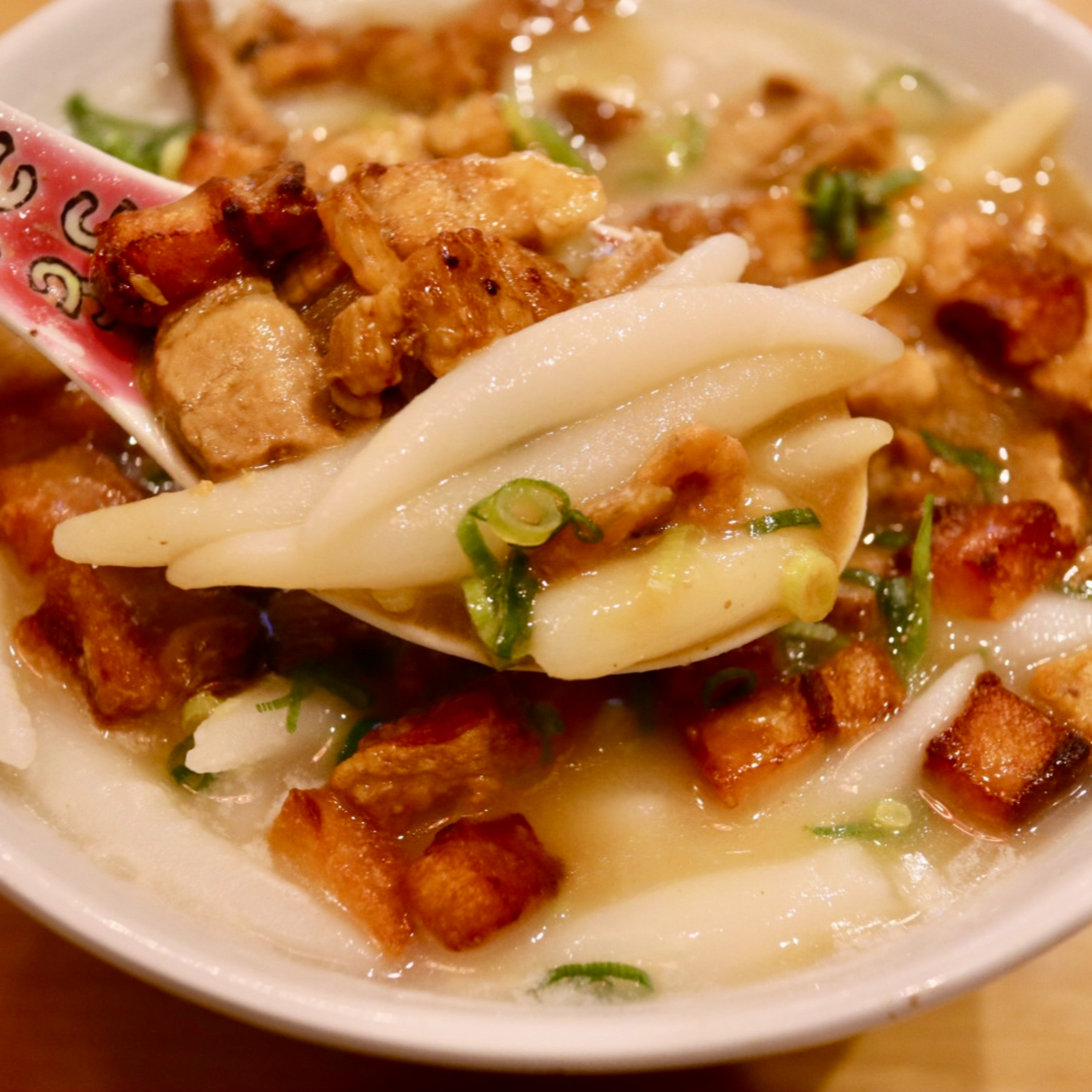 ・豚を揚げたものがふりかけのように乗っており、パンチが効いている