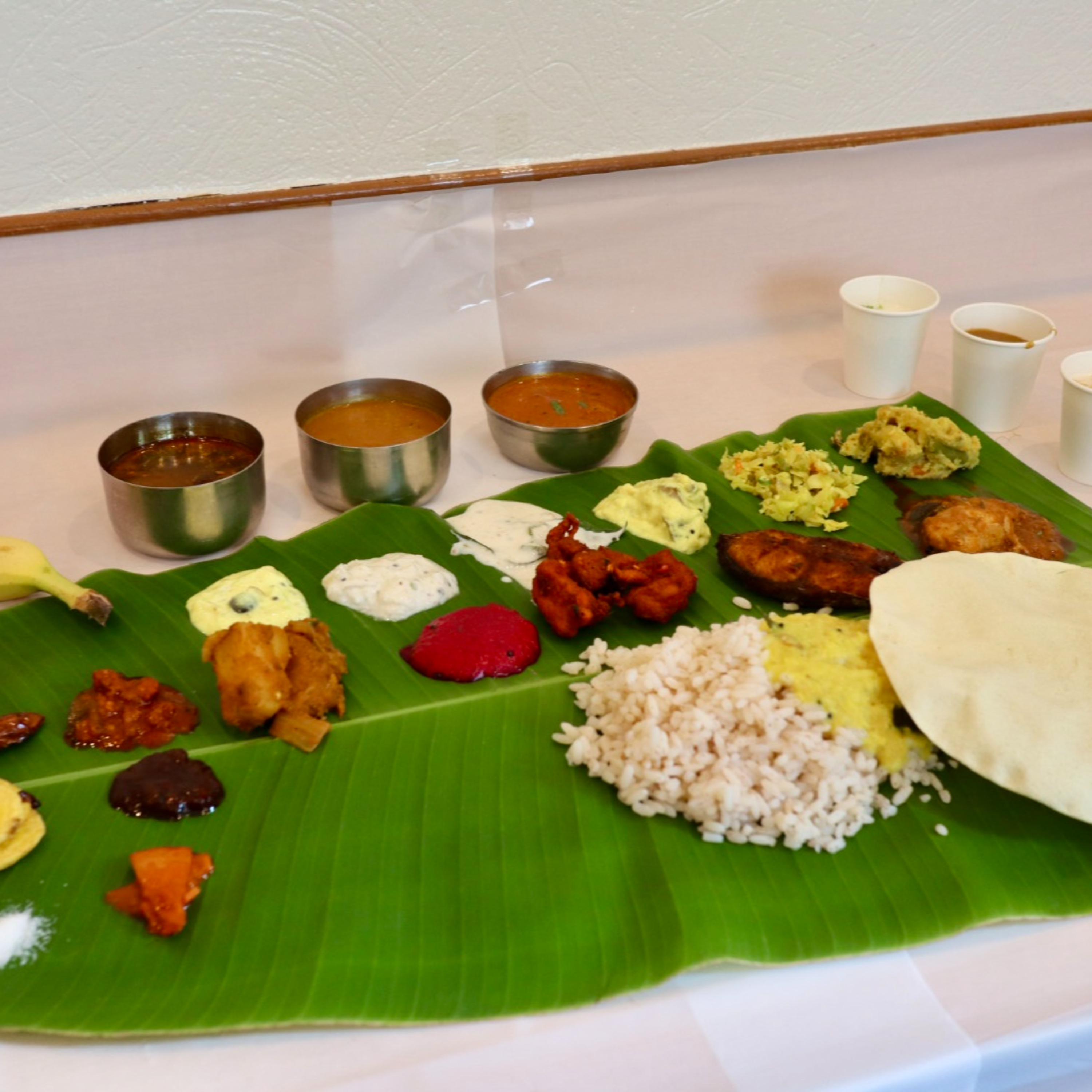 ・バナナ葉っぱの上に乗った30種類のケララの料理が食べ放題