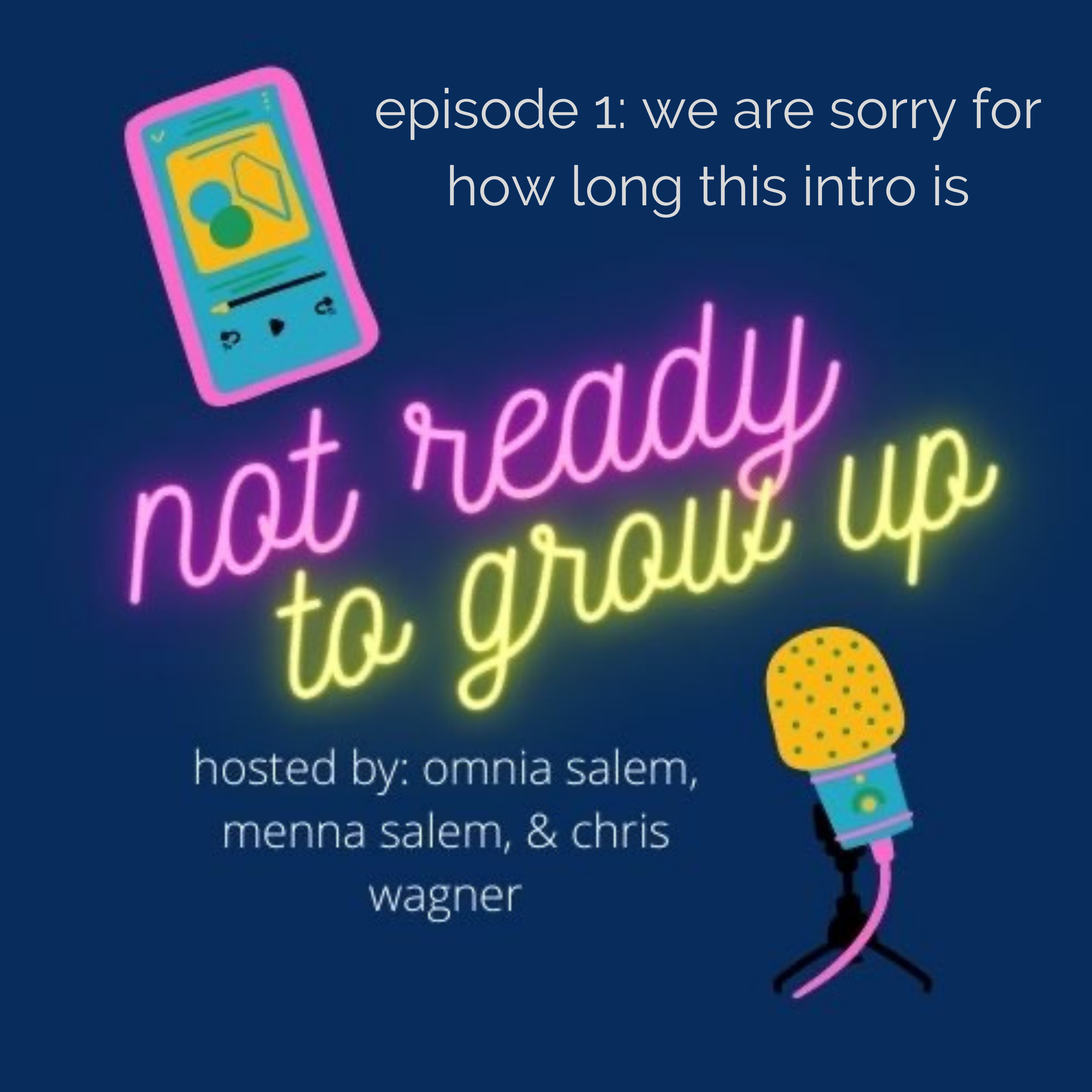 welcome to the first episode of the not ready to grow up podcast! in this episode, you will meet our three hosts, our technical producer, and our marketing guru. you will hear about us, our experiences, our friendships, and why we decided to start this podcast. growing up is part of life, we're just not ready for it yet. this podcast allows you to escape the harsh realities of entering the real world and enjoy apsects of your childhood through memories and long-lasting friendships.