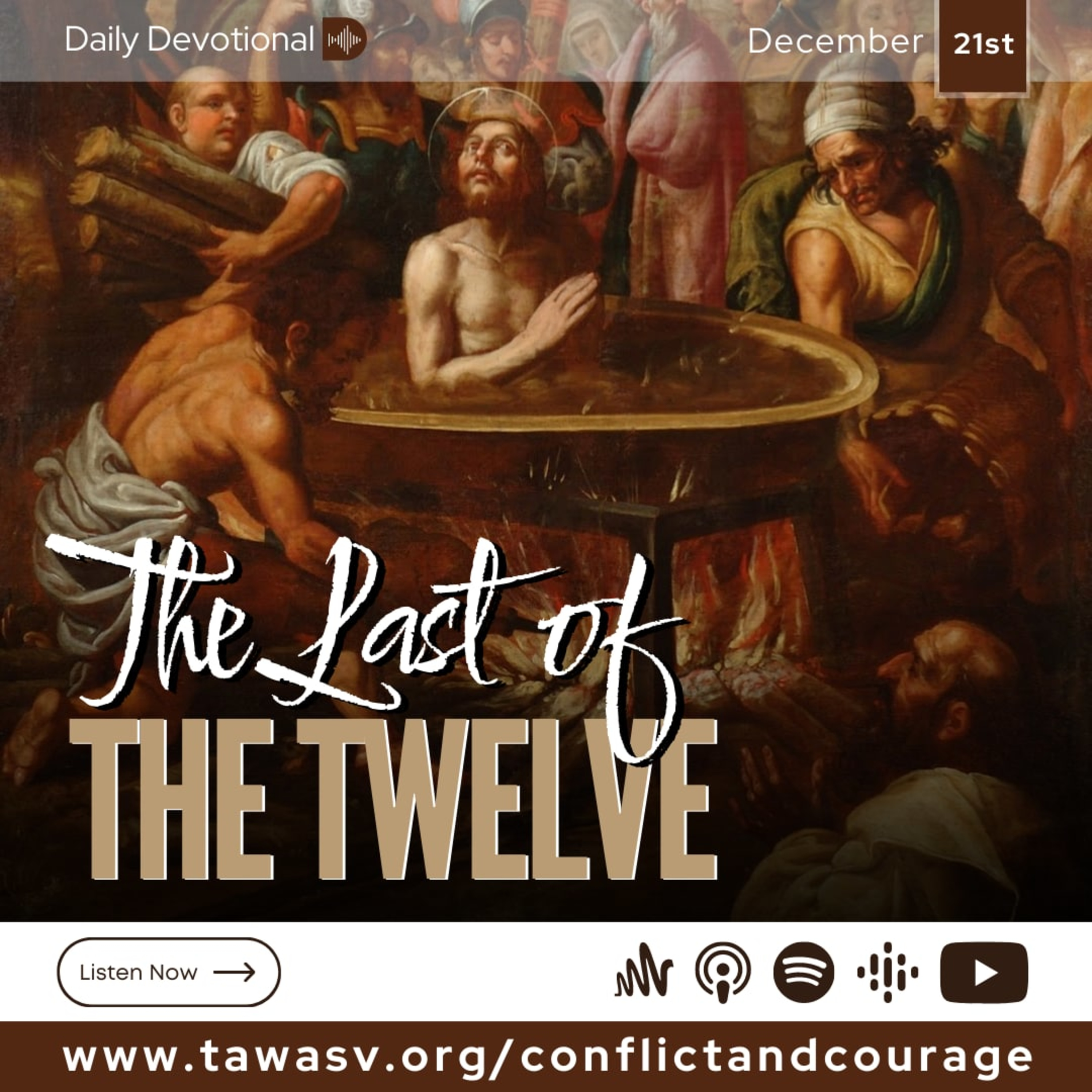 John was cast into a caldron of boiling oil; but the Lord preserved the life of His faithful servant, even as He preserved the three Hebrews in the fiery furnace. As the words were spoken, Thus perish all who believe in that deceiver, Jesus Christ of Nazareth, John declared, My Master patiently submitted to all that Satan and his angels could devise to humiliate and torture Him. He gave His life to save the world. I am honored in being permitted to suffer for His sake. I am a weak, sinful man. Christ was holy, harmless, undefiled. He did no sin, neither was guile found in His mouth. These words had their influence, and John was removed from the caldron by the very men who had cast him in. {CC 361.5}
