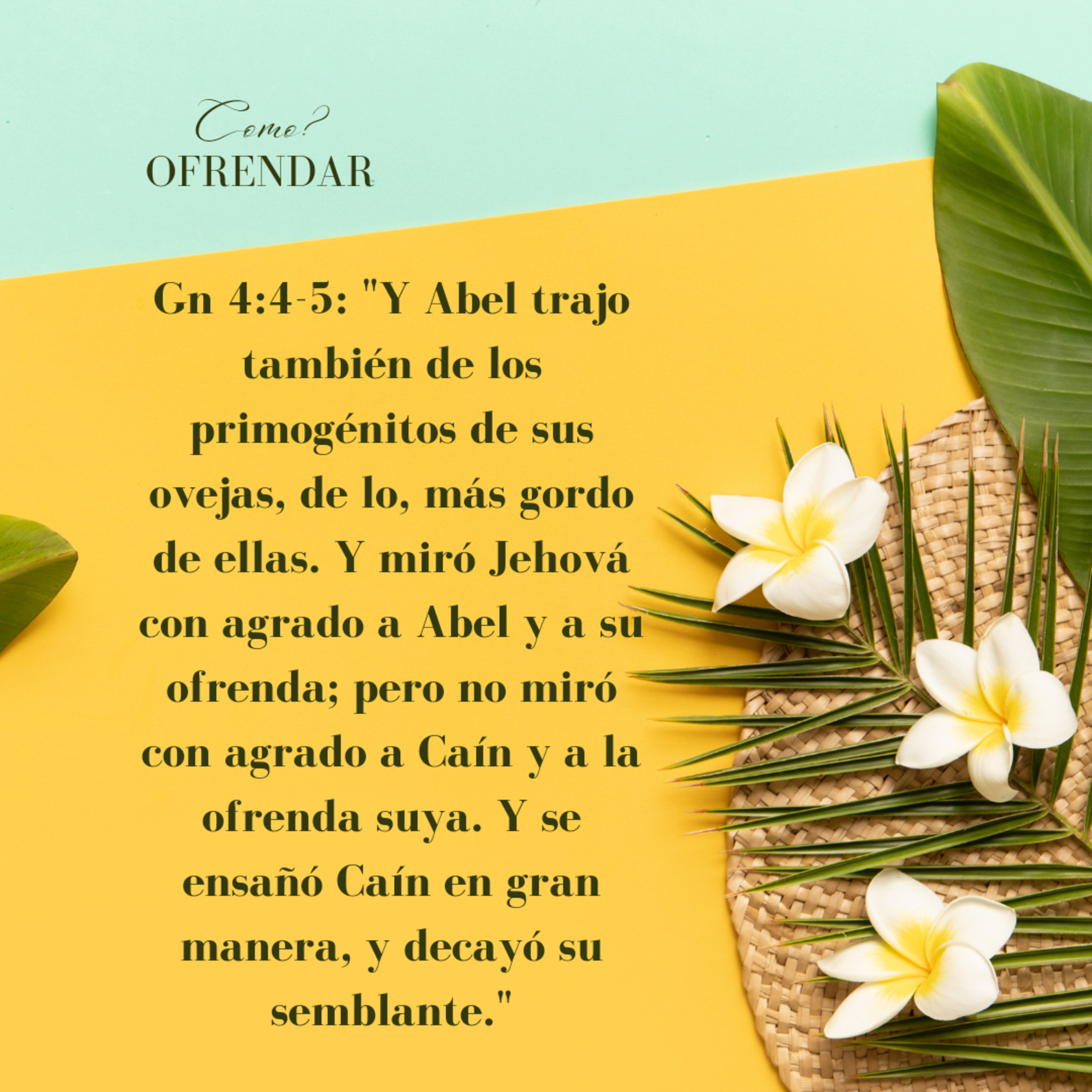 Gn 4:4-5: "Y Abel trajo también de los primogénitos de sus ovejas, de lo, más gordo de ellas. Y miró Jehová con agrado a Abel y a su ofrenda; pero no miró con agrado a Caín y a la ofrenda suya. Y se ensañó Caín en gran manera, y decayó su semblante."