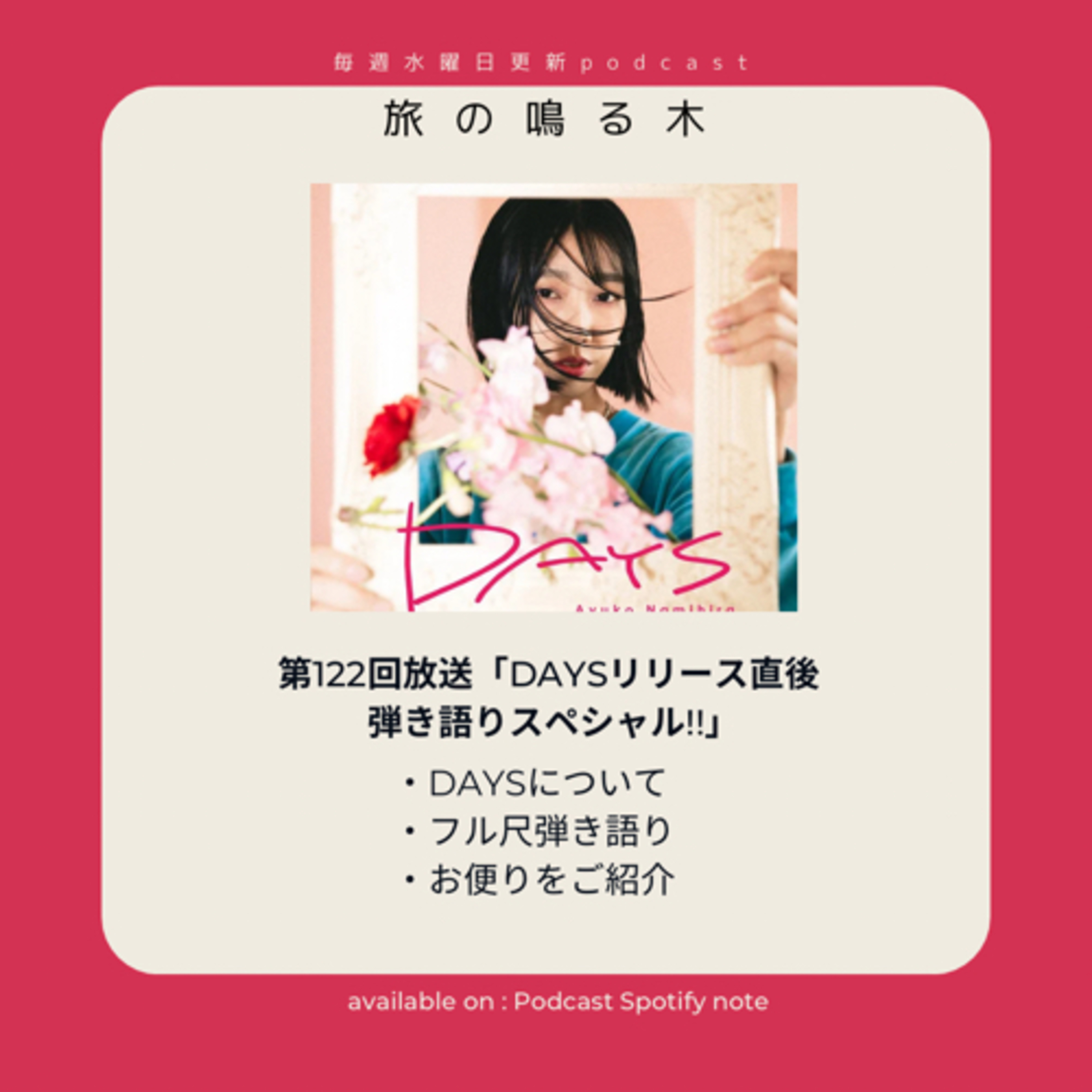 クラウドファンディングで2枚のCDを製作させて頂きましたがついに通常発売CD「 DAYS」もリリースする事ができました!クラウドファンディングにご支援頂いた皆様、日頃ナミヒラアユコの活動をサポートして下さっている皆様、ありがとうございます!今週の『旅の鳴る木』はリリース記念という事で弾き語りスペシャルです。皆様から頂いたアルバムの楽曲感想もご紹介していますよ!・DAYSについて・フル尺弾き語り・お便りをご紹介◾️ニューアルバム「DAYS」購入⬇️https://namihiraayuko.stores.jp/◆ナミヒラアユコ『DAYS』リリースワンマンライブ 予約受付中!✨https://tiget.net/events/256063◆「旅の鳴る木 サポートのお願い」https://note.com/tabino_naruki/n/n0cc586553517旅の魅力・音楽の魅力を発信する一つのメディアへ成長していきたいとおもっています!旅に関わる会社様、もはや何の関係もなくてもこのpodcast、ネットラジオに共感をくださる方、スポンサーさまお待ちしております!(▶tabino.naruki@gmail.com)◆ナミヒラ商店(CDや絵画販売)https://namihiraayuko.stores.jp/◆OPテーマ「Leave Port」- ナミヒラアユコ2020年アルバム『Plain』よりhttps://music.apple.com/jp/album/leave-port/1515008571?i=1515008575◆アルバム『薄明光線』https://ultravybe.lnk.to/hakumeikousen
