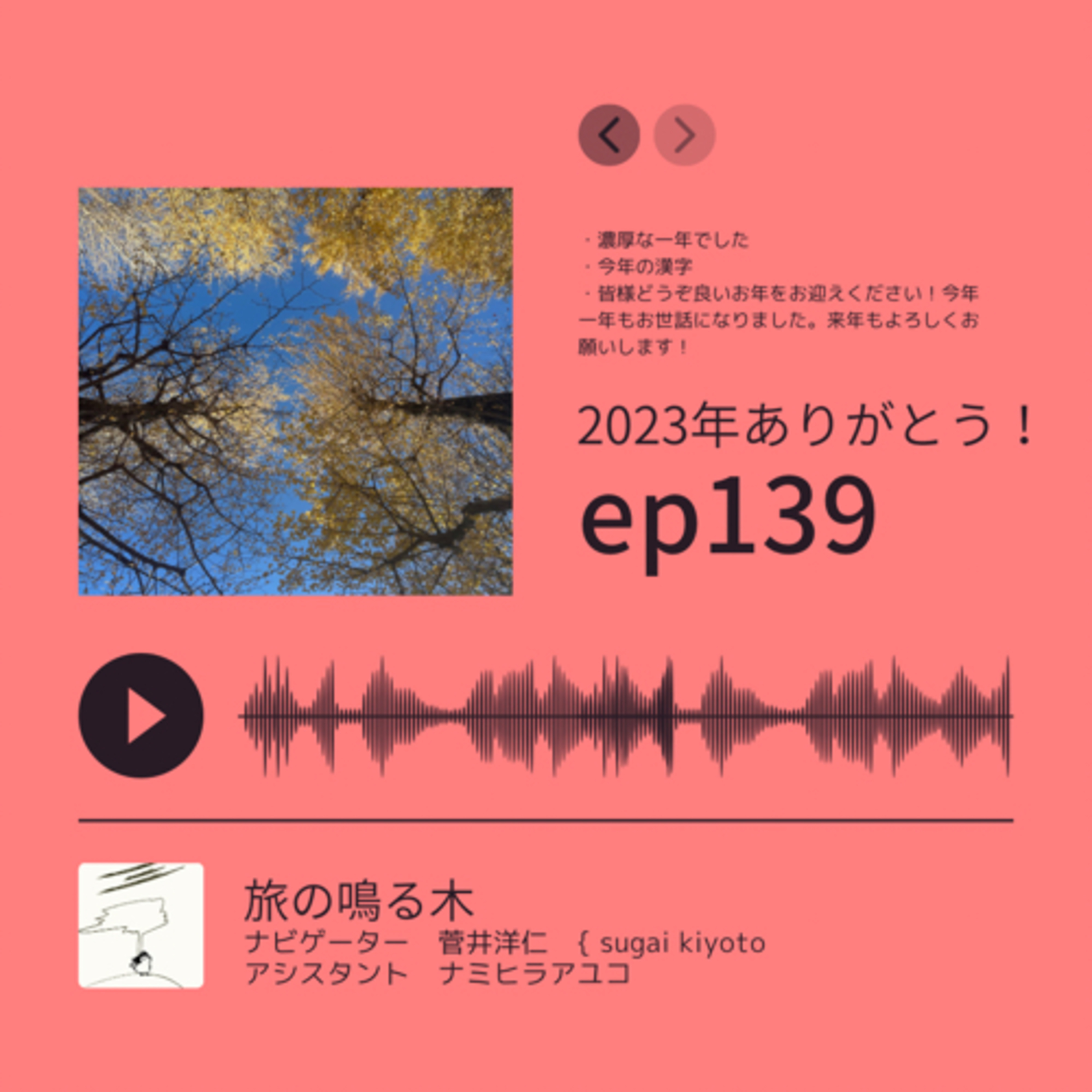 2023年も『旅の鳴る木』をご視聴、ご支援下さりありがとうございました!心からの謝意をお伝えします。この番組が出会いを生み、ナミヒラさんへの沢山の支援にも繋がりました。それを痛感する一年でした。今年の漢字でお話ししていますが非常に悩ましい一年でした。しかし出会いに救われたのも事実。年の瀬に残ったのはリスナーさんやpodcast仲間への感謝。・正月の過ごし方・今年の漢字・今年の漢字二文字・エンディングはあの曲で!皆様改めてありがとうございました。来年もどうぞよろしくお願いします!※新年は1月10日(水)からのスタートとなります◆「道」配信https://linkco.re/UMMBbH3b◆「道」リリックビデオhttps://www.youtube.com/watch?v=dAefHiQ6opE◆「最近あの子」配信https://linkco.re/b6yEFYfT◆「最近あの子」YouTubehttps://youtu.be/c-Tn4vBw8Fs?si=ikSGhZOSsNqCv3aK◆ニューアルバム「DAYS」購入https://namihiraayuko.stores.jp/◆「旅の鳴る木 サポートのお願い」https://note.com/tabino_naruki/n/n0cc586553517旅の魅力・音楽の魅力を発信する一つのメディアへ成長させたいと考えており支援者を募集しています!(tabino.naruki@gmail.com)◆スポンサー募集『旅の鳴る木』では店舗や商品PRを行いたい企業や個人を募集しています。予算に合わせて丁寧な番組制作を行いますのでお気軽にお問い合わせ下さい。担当:菅井(tabino.naruki@gmail.com)◆ナミヒラ商店(CDや絵画販売)https://namihiraayuko.stores.jp/◆OPテーマ「Leave Port」- ナミヒラアユコ2020年アルバム『Plain』よりhttps://music.apple.com/jp/album/leave-port/1515008571?i=1515008575◆アルバム『薄明光線』https://ultravybe.lnk.to/hakumeikousen