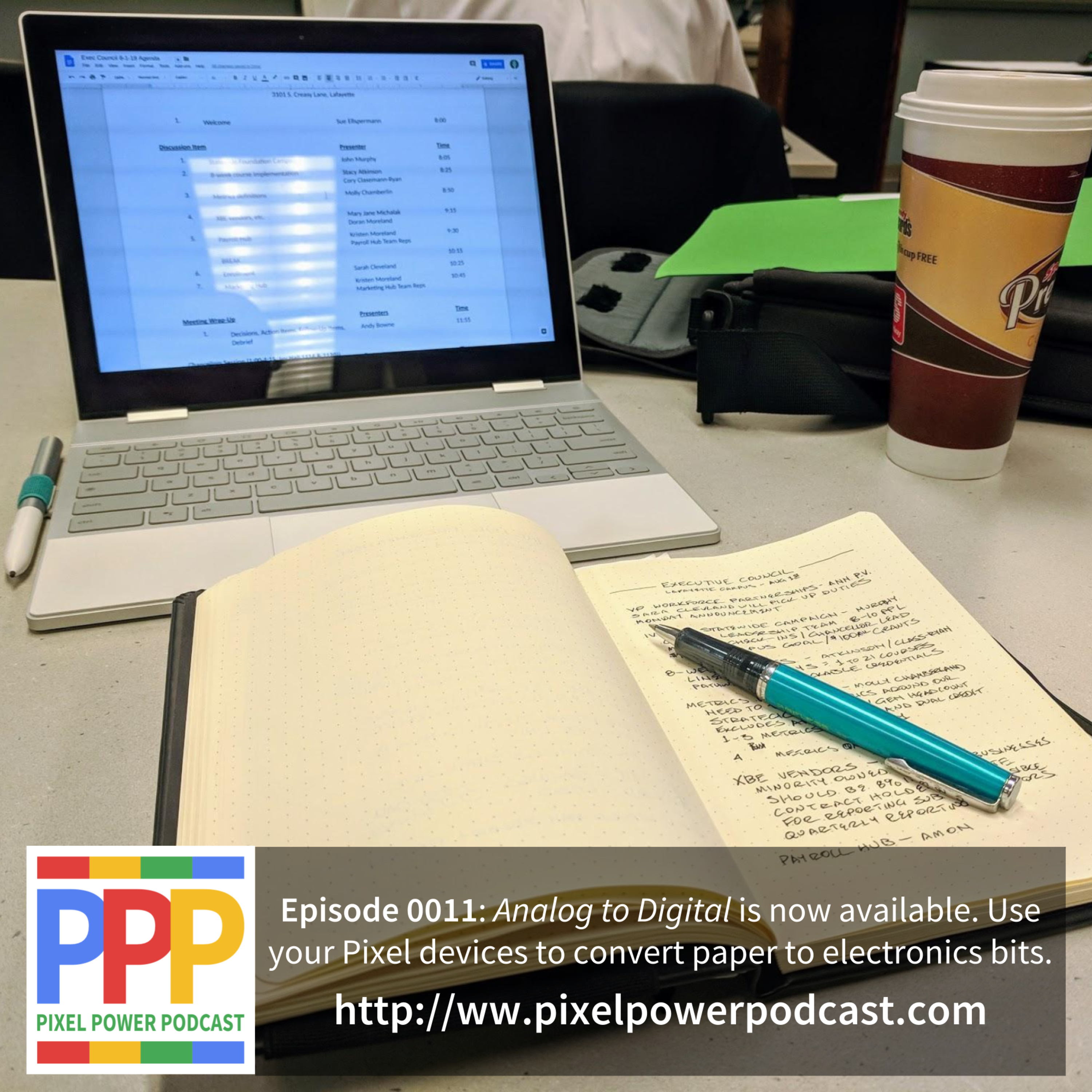 In Episode 0011 (2019-01-27) we learn how to take our analog notes (paper that is) and easily convert them to digital using our Pixel devices. We can then store, search and share the text information from those notes electronically. At the end of the show, I take a look at some news and why Google Fi users need to start planning for the future of messaging.