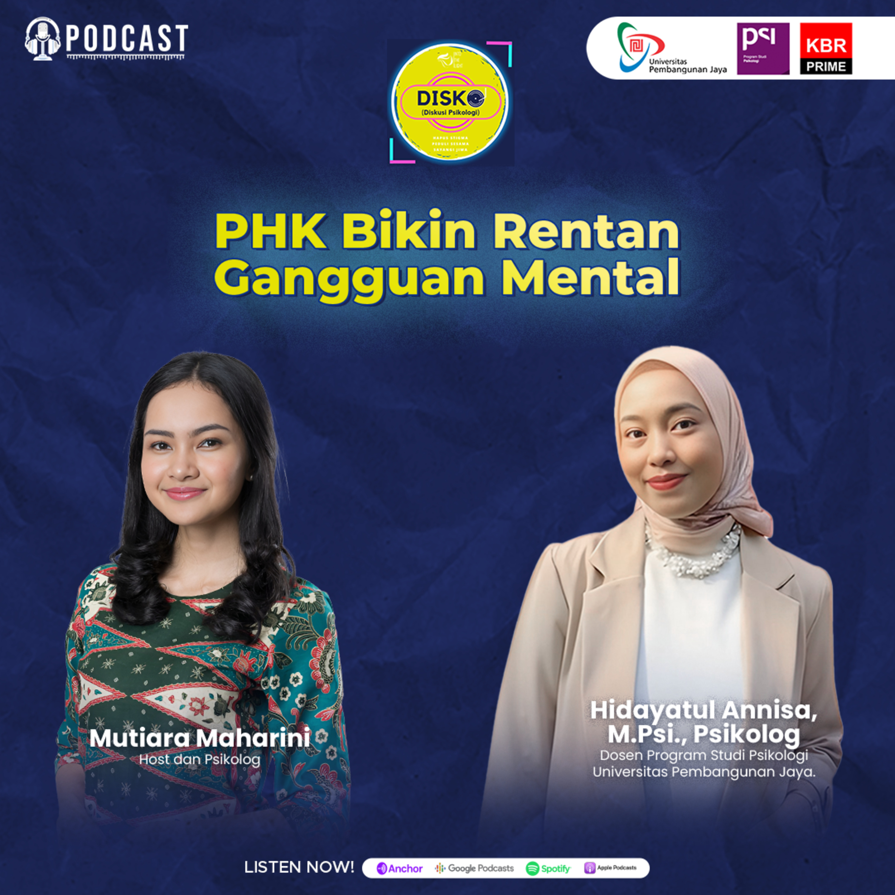 Belakangan, dampak kebijakan tarif bea masuk yang diumumkan Presiden Amerika Serikat (AS) Donald Trump bikin sejumlah negara ketar-ketir, tak terkecuali Indonesia yang kena imbas. Sejumlah perusahaan besar dikhawatirkan bakal mem-PHK buruhnya.Bahkan, Presiden Konfederasi Serikat Pekerja Indonesia (KSPI) Said Iqbal memprediksi tiga bulan ke depan akan terjadi PHK gelombang kedua dengan jumlah korban mencapai 50.000 pekerja. Padahal sebelumnya, KSPI mencatat 60 ribu buruh terkena pemutusan hubungan kerja (PHK) sepanjang Januari hingga awal Maret 2025. Menurutnya, situasi ini akan diperparah dengan kebijakan dagang baru yang dikeluarkan Trump. Sementara itu, tak jarang kita mendengar korban PHK mengalami depresi. Tak hanya kondisi finansial, PHK juga berpotensi mengganggu kondisi mental. Karena itulah, Podcast Disko "Diskusi Psikologi" membahas "PHK Rentan Gangguan Mental" bareng Hidayatul Annisa, M.Psi., Psikolog selaku Dosen Program Studi Psikologi Universitas Pembangunan Jaya.