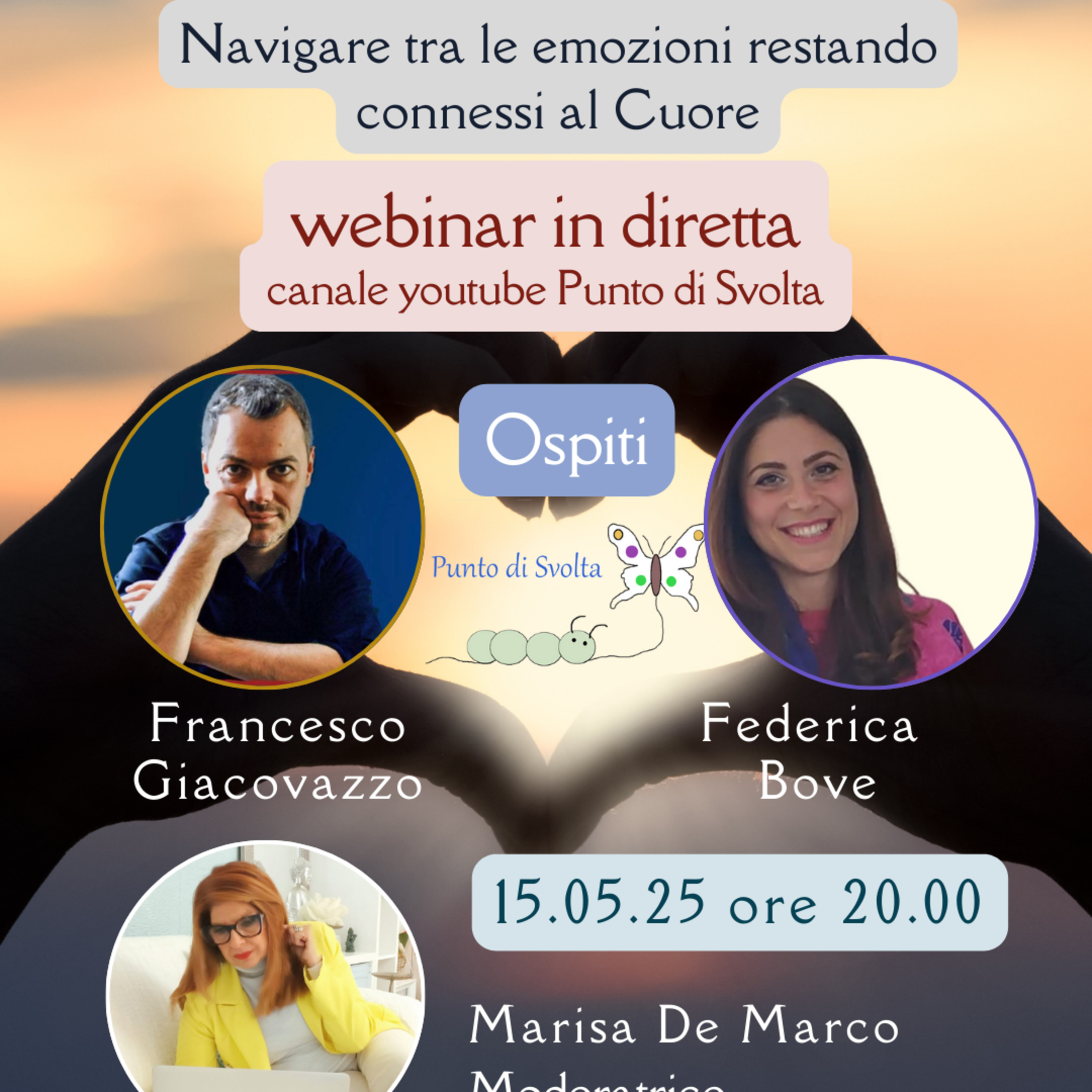Giovedì 15 maggio 2025 alle ore 20.00 abbiamo il piacere di ospitare uno scrittore, ricercatore e studioso di alchimia insieme a una Naturopata, Consulente in Nutrizione Vitale, Operatrice del Metodo di Medicina Integrativa Unificante del Dr. Nader ButtoFRANCESCO GIACOVAZZO e FEDERICA BOVEL’argomento della serata è:“RESTA NEL CUORE”Navigare tra le emozioni restando connessi al CuoreModera il webinar Marisa De Marco, Coach e Counselor transpersonale.Vi aspettiamo!Francesco Giacovazzo, è scrittore e studioso appassionato delle antiche tradizioni di saggezza nonché delle più moderne scoperte della scienza d’avanguardia. Si è laureato a Roma in Scienze della Comunicazione e ha continuato a studiare Psicologia e Sviluppo personale. Nei suoi libri si occupa di trasmettere i principi che regolano la realtà e che ci permettono di gestire la nostra vita diventando maestri del nostro sogno personale.Contatti FRANCESCO GIACOVAZZO:Sito web: https://www.francescogiacovazzo.it/Pg Fb: https://www.facebook.com/giacovazzofrancescoemail: fgiacovazzo@virgilio.itFederica Bove è Naturopata, consulente e ideatrice del metodo di Nutrizione Vitale. Specializzata in Medicina Integrativa Unificante, metodo del dott. Nader Butto. Esperta in trattamenti nutrizionali di prevenzione e cura delle malattie degenerative: metodo Gerson e Kousmine.Esperta in “la nuova medicina di Hamer” e metamedicina.Contatti FEDERICA BOVE:https://www.dottoressanatura.it/pagina Fb: https://www.facebook.com/federica.bove.79Contatti Punto di Svolta:e-mail: info.puntodisvolta@gmail.comMarisa 3356614905Lorena 3392515605Sito web: https://www.puntodisvolta-centrolistico.comSocial:Pagina Facebook: https://www.facebook.com/puntodisvolta.boCanale Youtube: / @puntodisvolta Canale Instagram: https://instagram.com/puntodisvoltaapsPodcast interviste su Spotify: https://open.spotify.com/show/2JZaetS5J9oF...Per sostenere le nostre attività puoi fare una piccola DONAZIONE su Paypal:info.puntodisvolta@gmail.como con Bonifico Bancario – causale: DONAZIONE - IBAN: IT04C0888302408034000