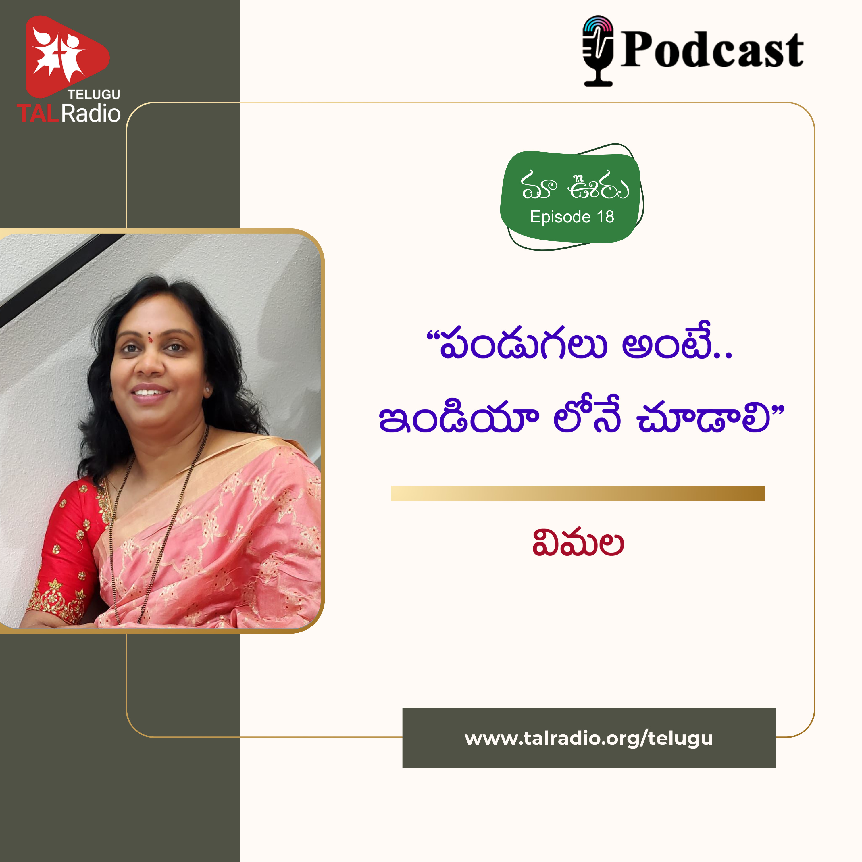 మా ఊరు కార్యక్రమంలో భాగంగా, పీలేరు గ్రామానికి చెందిన విమల గారితో ఈవారం ముచ్చటిద్దాం. ఆమె చిన్ననాటి జ్ఞాపకాలు, పీలేరు పరిసర ప్రాంతాలు, ముఖ్యంగా అప్పట్లో తిరుపతి ఎలా ఉండేది, అలాగే మన ఇండియాలో పండుగలు ఎలా జరుపుకుంటారు? ఇలాంటి ఎన్నో విషయాలు ఈ పాడ్కాస్ట్ లో మనతో పంచుకున్నారు .. విందామా మరి ?
